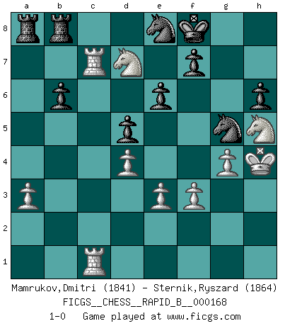 Last move : 1-0 2011 January 13 21:35:25 [Event "FICGS__CHESS__RAPID_B__000168"] [Site "FICGS"] [Date "2010.12.17"] [Round "1"] [White "Mamrukov,Dmitri"] [Black "Sternik,Ryszard"] [Result "1-0"] [WhiteElo "1841"] [BlackElo "1864"] 1.d4 Nf6 2.c4 g6 3.g3 c6 4.Nf3 d5 5.b3 Bg7 6.Bg2 O-O 7.O-O Ne4 8.Bb2 Nd7 9.e3 Ndf6 10.Ne5 Qd6 11.cxd5 cxd5 12.f3 Ng5 13.Ba3 Qd8 14.Qd2 Bh3 15.Nc3 Re8 16.Rac1 Bxg2 17.Kxg2 Qa5 18.Ne4 Qxd2+ 19.Nxd2 Ne6 20.g4 a5 21.h4 h6 22.Rc2 a4 23.Bb4 Bf8 24.bxa4 Rxa4 25.a3 Rb8 26.Nb3 b6 27.Nc1 R4a8 28.Ncd3 Ne8 29.Rfc1 Nf6 30.Kg3 g5 31.Rc6 gxh4+ 32.Kxh4 Nd8 33.R6c2 Ne6 34.Nf4 Ng5 35.Rc7 e6 36.Nh5 Ne8 37.Bxf8 Kxf8 38.Nd7+ 1-0 King's Indian : 3.g3 Kingside Castling by player Black (move 6) Kingside Castling by player White (move 7) Player White won this chess game. Follow this game move after move (download)A chess genius has died; a loss for humanity. (Viktor Kortchnoi, about Bobby Fischer's death) Ich bin der einzige Schachspieler, der sich während der Vorbereitungen zum Turnier verletzt hat. (Woody Allen) El Ajedrez es 99 por ciento táctica. (Teichmann) Karpov est une pièce de musée. (Garry Kasparov) You can't play chess if you're groggy from pills. (Anatoly Karpov)