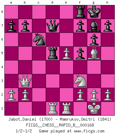 Last move : 1/2-1/2 2011 January 16 0:57:44 [Event "FICGS__CHESS__RAPID_B__000168"] [Site "FICGS"] [Date "2010.12.17"] [Round "1"] [White "Jabot,Daniel"] [Black "Mamrukov,Dmitri"] [Result "1/2-1/2"] [WhiteElo "1700"] [BlackElo "1841"] 1.e4 c6 2.d4 d5 3.e5 Bf5 4.Nf3 e6 5.Be2 c5 6.c3 Nc6 7.O-O cxd4 8.Nxd4 Nge7 9.Nxf5 Nxf5 10.Bd3 Be7 11.Re1 Qc7 12.Bxf5 exf5 13.Bf4 Rd8 14.Qd3 g6 15.Nd2 d4 16.Bh6 dxc3 17.Qxc3 Bb4 18.Qc2 Bf8 19.Bf4 Bg7 20.Bg5 Rd5 21.Qb3 Qd7 22.Nf3 O-O 23.Rad1 1/2-1/2 Caro-Kann : Advance variation Kingside Castling by player White (move 7) Kingside Castling by player Black (move 22) This chess game ended in a draw. Follow this game move after move (download)If cunning alone were needed to excel, women would be the best Chess players. (Albin) Ich kämpfe solange mein Gegner einen Fehler machen kann. (Emanuel Lasker) Solo existe una cosa que Fischer hace en el Ajedrez sin placer: ¡perder!. (Boris Spassky) La vie et les Echecs sont tous les deux une lutte constante. (Lasker) Information on the Internet is subject to the same rules and regulations as conversation at a bar. (George Lundberg)