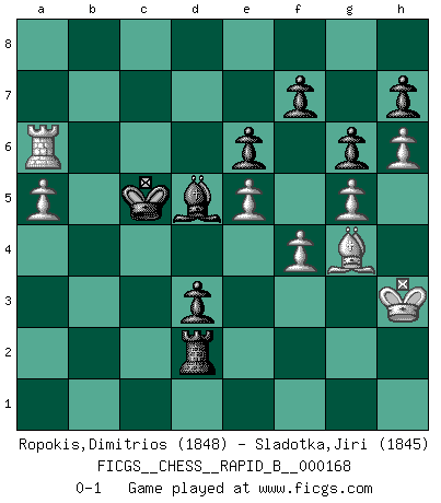 Last move : 0-1 2011 January 26 0:23:57 [Event "FICGS__CHESS__RAPID_B__000168"] [Site "FICGS"] [Date "2010.12.17"] [Round "1"] [White "Ropokis,Dimitrios"] [Black "Sladotka,Jiri"] [Result "0-1"] [WhiteElo "1848"] [BlackElo "1845"] 1.e4 c5 2.Nc3 g6 3.f4 Bg7 4.Nf3 Nc6 5.d3 e6 6.g3 Nge7 7.Bg2 O-O 8.O-O d6 9.Be3 Nd4 10.Bf2 Nec6 11.Nxd4 Nxd4 12.Ne2 Nxe2+ 13.Qxe2 Bxb2 14.Rab1 Bg7 15.e5 Rb8 16.d4 cxd4 17.Bxd4 b6 18.Rfd1 d5 19.c4 Ba6 20.Qe3 Bxc4 21.Bc3 Rc8 22.Bb4 Re8 23.a4 Qd7 24.a5 b5 25.Bf3 Bf8 26.Bc3 Bc5 27.Bd4 Bxd4 28.Qxd4 Qe7 29.Kg2 Rc7 30.Qd2 a6 31.g4 Rec8 32.Kg3 b4 33.Qxb4 Qxb4 34.Rxb4 Rc5 35.Ra1 Bb5 36.Rb3 Kf8 37.h4 Ke7 38.g5 Rc3 39.Rxc3 Rxc3 40.Kf2 Rc4 41.Kg3 Kd7 42.h5 d4 43.Kf2 Rc2+ 44.Kg3 Bc6 45.Bg4 d3 46.Ra3 Rg2+ 47.Kh3 Rd2 48.h6 Be4 49.Rb3 Kc6 50.Rb6+ Kc5 51.Rxa6 Bd5 0-1 Sicilian : Closed Kingside Castling by player Black (move 7) Kingside Castling by player White (move 8) Player Black won this chess game. Follow this game move after move (download)My God, Bobby Fischer plays so simply. (Alexei Suetin) Es ist peinlich, dass ich nie Weltmeister wurde. Es wäre leicht, Leonid Breschnjew als Ursache vorzuschieben, dessen Apparat den Vorzeigekommunisten Anatoli Karpow in allem unterstützte. Aber Garri Kasparow zum Beispiel, der ebenfalls von den Sowjets unerwünscht war, hat trotz der Widerstände den WM-Titel erobert. (Viktor Kortschnoi) En el tablero, la mentira e hipocresía no sobreviven mucho. (Emanuel Lasker) Seul un grand joueur sait à quel point il joue faiblement. (Xavier Tartacover) A generalist learns less and less about more and more until he knows nothing about everything. (Author unknown)