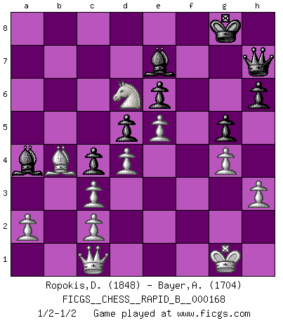 Last move : 1/2-1/2 2011 March 5 11:37:49 [Event "FICGS__CHESS__RAPID_B__000168"] [Site "FICGS"] [Date "2010.12.17"] [Round "1"] [White "Ropokis,Dimitrios"] [Black "Bayer,Alexander"] [Result "1/2-1/2"] [WhiteElo "1848"] [BlackElo "1704"] 1.e4 c5 2.Nc3 Nc6 3.f4 g6 4.Nf3 Bg7 5.Bb5 a6 6.Bxc6 bxc6 7.O-O Nf6 8.d3 d6 9.h3 Rb8 10.Qe1 O-O 11.g4 Re8 12.Qg3 c4 13.d4 d5 14.f5 Qb6 15.e5 Ne4 16.Qf4 Nxc3 17.bxc3 Rb7 18.Nh4 e6 19.fxg6 fxg6 20.Ba3 Qa5 21.Bb4 Qa4 22.Rf2 c5 23.Bxc5 Qa5 24.Bb4 Qd8 25.Nf3 a5 26.Bc5 Rf7 27.Qd2 Bd7 28.Raf1 Ba4 29.Ng5 Rxf2 30.Rxf2 h6 31.Nf7 Qh4 32.Kg2 Rb8 33.Qc1 Be8 34.Nd6 Ba4 35.Ba7 Rf8 36.Rxf8+ Bxf8 37.Bb6 Qe7 38.Bxa5 g5 39.Bb4 Qh7 40.Kg1 Be7 1/2-1/2 Sicilian : Grand Prix attack Kingside Castling by player White (move 7) Kingside Castling by player Black (move 10) This chess game ended in a draw. Follow this game move after move (download)I have always a slight feeling of pity for the man who has no knowledge of Chess. (Siegbert Tarrasch) Dass jemand wie Surab Asmaiparaschwili, der selbst Elopunkte gekauft hat , Vize-Präsident der Fide werden konnte, sagt schon einges über den Zustand dieser Organisation aus. (Joel Lautier) Vive, pierde y aprende al observar a tu oponente como gana. (Amber Steenbock) Un footballeur joue avec ses pieds, parfois avec sa tête. Un joueur d'échecs ne joue qu'avec sa tête. Et quand il ne joue plus, il meurt. (Jacob Murray) Excelling at chess has long been considered a symbol of more general intelligence. That is an incorrect assumption in my view, as pleasant as it might be. But for the purposes of argument and investigation, chess is, in Russkin-Gutman's words, 'an unparalleled laboratory, since both the learning process and the degree of ability obtained can be objectified and quantified, providing an excellent comparative framework on which to use rigorous analytical techniques.' (The Chess Master and the Computer, by Garry Kasparov - 2010)