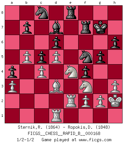 Last move : 1/2-1/2 2011 January 16 12:39:53 [Event "FICGS__CHESS__RAPID_B__000168"] [Site "FICGS"] [Date "2010.12.17"] [Round "1"] [White "Sternik,Ryszard"] [Black "Ropokis,Dimitrios"] [Result "1/2-1/2"] [WhiteElo "1864"] [BlackElo "1848"] 1.Nf3 Nf6 2.b4 d6 3.d4 Nbd7 4.c4 e5 5.e3 exd4 6.exd4 a5 7.b5 c6 8.Nc3 Be7 9.Bd3 O-O 10.O-O Re8 11.Re1 Nb6 12.Bf4 h6 13.Rb1 c5 14.d5 Nh5 15.Bd2 a4 16.h3 f5 17.Qc2 Bd7 18.Rbc1 Rf8 19.a3 g5 20.Ne2 Ng7 21.Ng3 Rf7 22.Re2 Qf8 23.Bc3 Bf6 24.Rce1 Bxc3 25.Qxc3 f4 26.Nf1 Nf5 27.N1d2 Qg7 28.Qxg7+ Kxg7 29.Kh2 Raf8 30.Ne4 Kh8 31.Rd1 Rg7 32.Kh1 Rgf7 33.Rf1 Re8 34.Rfe1 Kg7 35.Kh2 Nc8 36.Rd1 1/2-1/2 Reti Opening Kingside Castling by player Black (move 9) Kingside Castling by player White (move 10) This chess game ended in a draw. Follow this game move after move (download)Tactics flow from a superior position. (Bobby Fischer) Ich kenne keine einzige Person, die behaupten würde, Garri Kasparow sei ein guter Mensch (Nigel Short) Cuando tengo las piezas blancas, yo gano porque soy blanco; Cuando tengo las piezas negras, yo gano porque soy Bogolyubov. (Bogolyubov) Dans le domaine de la peinture, de la gravure et de la sculpture, dès la première décennie de notre siècle, les artistes abandonnent la représentation de la partie d'échecs pour se concentrer sur les pièces, sur les échiquiers et sur toutes les variations auxquelles les unes et les autres peuvent donner lieu. On passe en quelque sorte d'un thème social à un thème musical (au sens de la musica médiévale, c'est-à-dire d'une notion qui inclue le rythme, l'harmonie, la construction et la déconstruction, etc.). Graphiquement et picturalement, l'échiquier apparaît comme une structure ouverte, dynamique, d'une richesse infinie, autorisant toutes les combinatoires et débouchant sur des mouvements et des rythmes de nature exponentielle. (Michel Pastoureau) Imagination is more important than knowledge. Knowledge is limited. Imagination encircles the world. (Albert Einstein)
