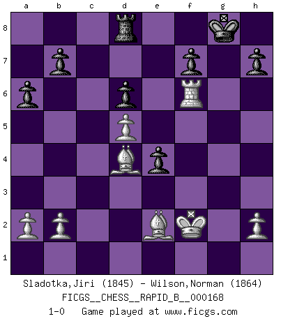 Last move : 1-0 2011 February 1 14:54:46 [Event "FICGS__CHESS__RAPID_B__000168"] [Site "FICGS"] [Date "2010.12.17"] [Round "1"] [White "Sladotka,Jiri"] [Black "Wilson,Norman"] [Result "1-0"] [WhiteElo "1845"] [BlackElo "1864"] 1.e4 c5 2.Nf3 e6 3.d4 cxd4 4.Nxd4 a6 5.Bd3 Nf6 6.O-O d6 7.c4 Be7 8.Nc3 O-O 9.f4 e5 10.Nf5 Bxf5 11.exf5 Qb6+ 12.Kh1 Nc6 13.g4 Nb4 14.g5 Qc6+ 15.Kg1 Qc5+ 16.Kg2 Qc6+ 17.Kh3 Ne8 18.Nd5 Nxd5 19.cxd5 Qc8 20.Kg2 Qc5 21.Qb3 Qd4 22.f6 Nxf6 23.gxf6 e4 24.fxe7 Rfe8 25.Be2 Rxe7 26.Be3 Qf6 27.Qb6 Rae8 28.f5 Rd7 29.Qd4 Qxd4 30.Bxd4 Rc7 31.Rac1 R7c8 32.f6 gxf6 33.Rxc8 Rxc8 34.Rxf6 Rd8 35.Kf2 1-0 Sicilian : Kan, 5.Bd3 Kingside Castling by player White (move 6) Kingside Castling by player Black (move 8) Player White won this chess game. Follow this game move after move (download)Chess is like life. (Boris Spassky) Schach ist ein Teil der Kultur, und wenn es mit der Kultur abwärts geht, geht es auch mit dem Schach abwärts. (Mikhail Moiseyevich Botvinik) El Ajedrez moderno está demasiado preocupado con cosas como la estructura de Peones. Olvidenlo, el Jaque Mate termina la partida. (Nigel Short) A chaque perte on perd un peu de soi. (Joël Lautier) Computer Science is no more about computers than astronomy is about telescopes. (Edsger W. Dijkstra)