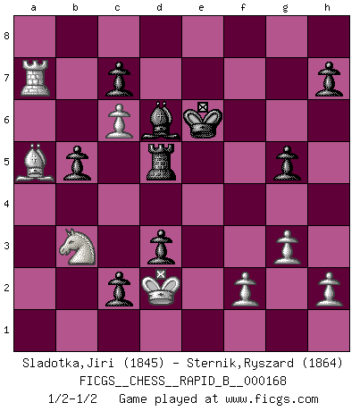 Last move : 1/2-1/2 2011 January 6 9:21:18 [Event "FICGS__CHESS__RAPID_B__000168"] [Site "FICGS"] [Date "2010.12.17"] [Round "1"] [White "Sladotka,Jiri"] [Black "Sternik,Ryszard"] [Result "1/2-1/2"] [WhiteElo "1845"] [BlackElo "1864"] 1.e4 e5 2.Nf3 Nc6 3.Bb5 a6 4.Ba4 Nf6 5.O-O Nxe4 6.d4 b5 7.Bb3 d5 8.dxe5 Be6 9.Nbd2 Nc5 10.c3 d4 11.Ng5 Qxg5 12.Qf3 O-O-O 13.Bxe6+ fxe6 14.Qxc6 Qxe5 15.b4 Qd5 16.Qxd5 exd5 17.bxc5 dxc3 18.Nb3 d4 19.Ba3 Be7 20.Bb4 Bf6 21.a4 Kd7 22.axb5 axb5 23.Ra6 Ke7 24.Rc1 Rhe8 25.Kf1 Rd5 26.c6 Kf7 27.Ra7 Be5 28.g3 g5 29.Re1 c2 30.Ke2 d3+ 31.Kd2 Bd6 32.Ba5 Rxe1 33.Kxe1 Ke6 34.Kd2 1/2-1/2 Ruy Lopez : Open, 7.Bb3 Kingside Castling by player White (move 5) Queenside Castling by player Black (move 12) This chess game ended in a draw. Follow this game move after move (download)When the Chess game is over, the Pawn and the King go back to the same box. (Irish saying) Garry Kasparov war erst in der Großmeister-Organisation GMA, dann in der Profischach-Vereinigung PCA, zum Schluss kehrte er wieder in den Schoß der FIDE zurück. Aber gut, manche Leute sind flexibel (Viswanathan Anand) De todos mis libros Rusos, la defensa contiene y difunde el 'calor' mas grande que pudiese verse extraño al observar lo supremamente abstracto que el Ajedrez supuestamente es. (Vladimir Nabokov) Soyez une menace à chaque fois que vous vous asseyez pour jouer. (Ken Smith) Every now and then a man's mind is stretched by a new idea and never shrinks back to its former dimensions. (Oliver Wendell Holmes, Sr.)