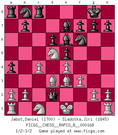 Last move : 1/2-1/2 2011 January 6 9:16:12 [Event "FICGS__CHESS__RAPID_B__000168"] [Site "FICGS"] [Date "2010.12.17"] [Round "1"] [White "Jabot,Daniel"] [Black "Sladotka,Jiri"] [Result "1/2-1/2"] [WhiteElo "1700"] [BlackElo "1845"] 1.e4 c5 2.Nf3 d6 3.d4 cxd4 4.Nxd4 Nf6 5.f3 e5 6.Nb3 Be6 7.c4 a5 8.Be3 Be7 9.Nc3 a4 10.Nc1 Qa5 11.Qd2 O-O 12.Bd3 Rc8 13.Nd5 Qxd2+ 1/2-1/2 Sicilian : Prins (Moscow) variation Kingside Castling by player Black (move 11) This chess game ended in a draw. Follow this game move after move (download)You may learn much more from a game you lose than from a game you win. You will have to lose hundreds of games before becoming a good player. (Jose Raul Capablanca) Im Schach gewinnt jeder. Hat man Freunde am Spiel - und das ist die Hauptsache - ist auch der Verlust einer Partie kein Unglück. (David Bronstein) Una partida de Ajedrez se divide en 3 etapas: la primera cuando piensas que tienes la ventaja, la segunda cuando crees que tienes la ventaja y la tercera... ¡cuando te das cuenta que vas a perder!. (Savielly Tartakower) Comme les marins qui ont mille raisons différentes d'aller en mer, les joueurs d'échecs en ont tout autant avant de s'installer devant une table et jouer... (Vincent Bertignac, philosophe) The difference between perseverance and obstinacy is that one comes from a strong will, and the other from a strong won't. (Henry Ward Beecher)