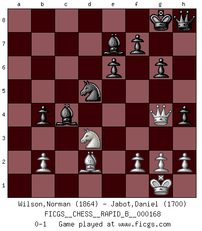 Last move : 0-1 2011 February 9 8:46:22 [Event "FICGS__CHESS__RAPID_B__000168"] [Site "FICGS"] [Date "2010.12.17"] [Round "1"] [White "Wilson,Norman"] [Black "Jabot,Daniel"] [Result "0-1"] [WhiteElo "1864"] [BlackElo "1700"] 1.d4 d5 2.c4 e6 3.Nf3 Nf6 4.Nc3 c6 5.e3 Nbd7 6.Bd3 dxc4 7.Bxc4 b5 8.Bd3 Bd6 9.O-O O-O 10.Bd2 Bb7 11.Rc1 Rc8 12.a3 a5 13.Ne4 Nxe4 14.Bxe4 Nf6 15.Bd3 b4 16.axb4 axb4 17.e4 Be7 18.e5 Nd5 19.Qe2 Re8 20.Qe4 g6 21.Ra1 c5 22.Rfc1 Qb6 23.dxc5 Rxc5 24.Rxc5 Bxc5 25.Qh4 h5 26.Bh6 Ra8 27.Rxa8+ Bxa8 28.Nd2 Bc6 29.Nb3 Be7 30.Qg3 Be8 31.Bd2 Qa7 32.Bb1 Qc7 33.Nc1 h4 34.Qg4 Qxe5 35.Nd3 Qh8 36.Ba2 Bb5 37.Bc4 Bxc4 0-1 Queen's gambit declined Kingside Castling by player White (move 9) Kingside Castling by player Black (move 9) Player Black won this chess game. Follow this game move after move (download)I like the moment when I break a man's ego. (Bobby Fischer) Unter Putin wird alles Geld aus Russland wie von einem Staubsauger nach Moskau umgeleitet, das ist wie ein schwarzes Loch. (Garry Kasparov) El Peón aislado arroja penumbra sobre todo el tablero. (Aaron Nimzovich) La vie est comme un jeu d'échecs : nous esquissons un plan, mais celui-ci est tributaire de ce que daignent faire l'adversaire aux échecs et le destin dans la vie. (Arthur Schopenhauer) He who is a good ruler must first have been ruled. (Aristotle)