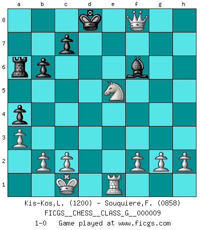 Last move : 1-0 2006 December 12 21:55:42 [Event "FICGS__CHESS__CLASS_G__000009"] [Site "FICGS"] [Date "2006.12.03"] [Round "1"] [White "Kis-Kos,Laszlo"] [Black "Souquiere,Florence"] [Result "1-0"] [WhiteElo "1200"] [BlackElo "0858"] 1.e4 Nc6 2.d4 g5 3.Bxg5 Nf6 4.Nc3 Rg8 5.Bxf6 exf6 6.Nf3 Bb4 7.Qd2 Rg4 8.Qd3 b6 9.e5 a5 10.a3 Be7 11.O-O-O Ba6 12.Qxh7 d6 13.Nd5 Kd7 14.Qf5+ Ke8 15.Qxg4 fxe5 16.dxe5 dxe5 17.Nf6+ Bxf6 18.Rxd8+ Nxd8 19.Bxa6 Rxa6 20.Re1 Ne6 21.Nxe5 a4 22.Qg8+ Nf8 23.Qxf7+ Kd8 24.Qxf8+ 1-0 KP : Nimzovich defense Queenside Castling by player White (move 11) Player White won this chess game. Follow this game move after move (download)I'd rather have a Pawn than a finger. (Reuben Fine) Ich habe die besten Aussichten, den ersten Preis zu gewinnen - denn jeder muss gegen Steinitz spielen, nur ich nicht! (Wilhelm Steinitz) Yo tuve un dolor de muelas en la primer partida. En el segundo juego, tuve un dolor de cabeza. En el tercero, tuve un ataque de reumatísmo. En la cuarta partida, no me sentía muy bien. ¿Y en el quinto juego? Bueno, ¿que acaso uno tiene que ganar todos los juegos?. (Siegbert Tarrasch) Les échecs sont utiles à l'exercice de la faculté de penser et à celle de l'imagination. Car nous devons posséder une méthode élaborée pour atteindre des buts partout où nous devons conduire notre raison. (Leibnitz) Luck is the residue of design. (John Milton)