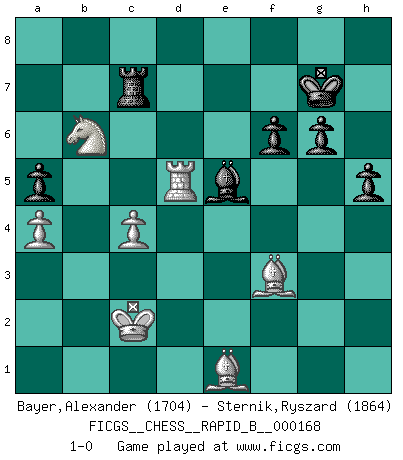 Last move : 1-0 2011 January 26 20:20:16 [Event "FICGS__CHESS__RAPID_B__000168"] [Site "FICGS"] [Date "2010.12.17"] [Round "1"] [White "Bayer,Alexander"] [Black "Sternik,Ryszard"] [Result "1-0"] [WhiteElo "1704"] [BlackElo "1864"] 1.e4 e5 2.f4 d5 3.exd5 e4 4.d3 Nf6 5.dxe4 Nxe4 6.Nf3 Bc5 7.Qe2 Bf2+ 8.Kd1 Qxd5+ 9.Nfd2 O-O 10.Qxe4 Qd8 11.Bd3 Bg4+ 12.Nf3 g6 13.Qxb7 Nd7 14.Qd5 Be6 15.Qa5 Bb6 16.Qc3 Nf6 17.Bd2 Nd5 18.Qa3 Ne3+ 19.Kc1 Nxg2 20.Be4 Rb8 21.Ne5 Nh4 22.Nc6 Qf6 23.Qc3 Qxc3 24.Nxc3 Rbe8 25.a4 a5 26.Re1 Bf2 27.Rf1 Bb6 28.Nd5 Bxd5 29.Bxd5 Nf5 30.Bf3 Ne3 31.Re1 Nc4 32.Ne7+ Kg7 33.Bc3+ f6 34.Nd5 Rxe1+ 35.Bxe1 Bd4 36.c3 Bg1 37.Nxc7 Rc8 38.Nd5 Bxh2 39.b3 Nd6 40.c4 Nxc4 41.bxc4 Bxf4+ 42.Kc2 Be5 43.Nb6 Rc7 44.Rd1 h5 45.Rd5 1-0 KGD : Falkbeer, 5.de Kingside Castling by player Black (move 9) Player White won this chess game. Follow this game move after move (download)Chess teaches you to control the initial excitement you feel when you see something that looks good and it trains you to think objectively when you're in trouble. (Stanley Kubrick) Ich habe die Schachforschung dermaßen betrieben, dass sie auf eine wissenschaftliche Basis gestellt wurde. (Mikhail Moiseyevich Botvinik) Del Ajedrez se ha dicho que la vida no es lo suficientemente larga para él, pero eso es culpa de la vida, no del Ajedrez. (William Ewart Napier) Aidez vos pièces, elles vous aideront. (Paul Morphy) However beautiful the strategy, you should occasionally look at the results. (Winston Churchill)