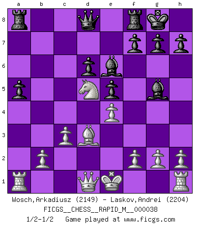 Last move : 1/2-1/2 2011 March 9 17:16:23 [Event "FICGS__CHESS__RAPID_M__000038"] [Site "FICGS"] [Date "2010.12.17"] [Round "1"] [White "Wosch,Arkadiusz"] [Black "Laskov,Andrei"] [Result "1/2-1/2"] [WhiteElo "2149"] [BlackElo "2204"] 1.e4 c5 2.Nf3 Nc6 3.d4 cxd4 4.Nxd4 Nf6 5.Nc3 e5 6.Ndb5 d6 7.Bg5 a6 8.Na3 b5 9.Nd5 Be7 10.Bxf6 Bxf6 11.c3 Bg5 12.Nc2 Ne7 13.Ncb4 O-O 14.a4 bxa4 15.Qxa4 Bd7 16.Qd1 a5 17.Nxe7+ Bxe7 18.Nd5 Bg5 19.Bd3 Be6 1/2-1/2 Sicilian : Pelikan (Lasker/Sveshnikov) variation Kingside Castling by player Black (move 13) This chess game ended in a draw. Follow this game move after move (download)You cannot play at Chess if you are kind-hearted. (French Proverb) Ich war schon mal beim Dopingtest. Da musste ich Urin abgeben, während Dritte zusahen. (Elisabeth Pähtz) En el tablero, la mentira e hipocresía no sobreviven mucho. (Emanuel Lasker) Le moment que je préfère le plus dans une rencontre, c'est celui où je sens que la personnalité de l'adversaire se brise. (Robert Fischer) May I never be complete. May I never be content. May I never be perfect. Deliver me, Tyler, from being perfect and complete. (Chuck Palahniuk, Fight Club)