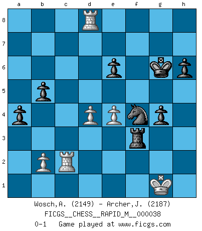 Last move : 0-1 2011 July 1 12:51:27 [Event "FICGS__CHESS__RAPID_M__000038"] [Site "FICGS"] [Date "2010.12.17"] [Round "1"] [White "Wosch,Arkadiusz"] [Black "Archer,J. Robert"] [Result "0-1"] [WhiteElo "2149"] [BlackElo "2187"] 1.e4 e5 2.Nf3 Nc6 3.Bc4 Nf6 4.d3 Be7 5.O-O O-O 6.Re1 d6 7.a4 Na5 8.Ba2 c5 9.Na3 Be6 10.Bxe6 fxe6 11.Bd2 Nc6 12.Nc4 h6 13.c3 a6 14.a5 Qe8 15.Qb3 Rb8 16.h3 Kh8 17.Re2 Nd7 18.Qd1 Rxf3 19.gxf3 Qf7 20.Kg2 d5 21.Nb6 Nxb6 22.axb6 Rf8 23.Re1 Bd8 24.Rg1 Bxb6 25.Be3 Qh5 26.Ra3 d4 27.cxd4 cxd4 28.Bd2 Bc5 29.Ra1 Kh7 30.Rb1 Bb4 31.Bxb4 Nxb4 32.Rc1 Nc6 33.Rc4 Rf4 34.Rc2 Rh4 35.Rh1 Ne7 36.f4 Qg6+ 37.Kf1 Rxf4 38.Rg1 Qf7 39.Rg3 Ng6 40.Kg1 Rf6 41.Qh5 a5 42.Rc4 b6 43.Rc2 a4 44.Kh1 b5 45.f3 Nf4 46.Qxe5 Nh5 47.R3g2 Rxf3 48.Rc7 Rf1+ 49.Kh2 Qf8 50.Rgc2 Qf4+ 51.Qxf4 Nxf4 52.Rd7 Rf3 53.Rxd4 Rxh3+ 54.Kg1 g5 55.Rd8 Rg3+ 56.Kf1 Rf3+ 57.Kg1 g4 58.d4 Kg6 0-1 Two knights defense (Modern Bishop's Opening) Kingside Castling by player White (move 5) Kingside Castling by player Black (move 5) Player Black won this chess game. Follow this game move after move (download)You must take your opponent into a deep dark forest where 2+2=5, and the path leading out is only wide enough for one. (Mikhail Tal) Wer wird heute Abend ihr Gegner sein? -- Heute Abend spiele ich gegen die schwarzen Steine. (Akiba Rubinstein) Muchos se han convertido en Maestros de Ajedrez, nadie se ha convertido en el Maestro del Ajedrez. (Siegbert Tarrasch) La vie et les Echecs sont tous les deux une lutte constante. (Lasker) You can think I'm wrong, but that's no reason to quit thinking. (Gregory House, House M.D.)