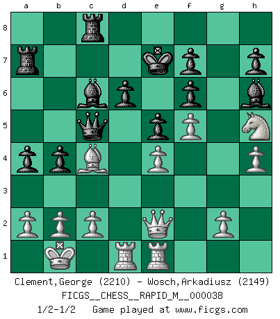 Last move : 1/2-1/2 2011 March 8 17:15:10 [Event "FICGS__CHESS__RAPID_M__000038"] [Site "FICGS"] [Date "2010.12.17"] [Round "1"] [White "Clement,George"] [Black "Wosch,Arkadiusz"] [Result "1/2-1/2"] [WhiteElo "2210"] [BlackElo "2149"] 1.e4 c5 2.Nf3 Nc6 3.d4 cxd4 4.Nxd4 Nf6 5.Nc3 d6 6.Bg5 e6 7.Qd2 a6 8.O-O-O Bd7 9.f4 b5 10.Bxf6 gxf6 11.Kb1 Qb6 12.Nce2 b4 13.Nxc6 Bxc6 14.f5 e5 15.Ng3 Qc5 16.Nh5 Ke7 17.Bd3 Rg8 18.Rhe1 a5 19.Qe2 a4 20.Bc4 Ra5 21.Rd2 Ra7 22.h4 Bh6 23.R2d1 Rc8 1/2-1/2 Sicilian defense Queenside Castling by player White (move 8) This chess game ended in a draw. Follow this game move after move (download)Bobby Fischer is the greatest Chess genius of all time ! (Alexander Kotov) Schach ist die gewalttätigste aller Sportarten. (Garry Kasparov) El Ajedrez es un expediente tonto que hace creer a la gente inactiva que hacen una cosa muy astuta cuando solamente estan perdiendo su tiempo. (George Bernard Shaw) Les Echecs représentent une sphère d'idées créatrices basée sur la volonté des deux protagonistes. (Smyslov) Hold em is to stud what chess is to checkers. (Johnny Moss)