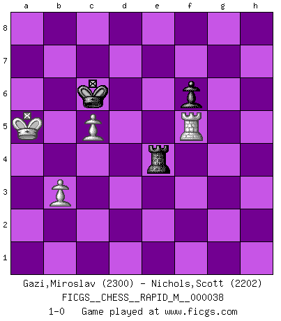 Last move : 1-0 2011 February 26 17:8:35 [Event "FICGS__CHESS__RAPID_M__000038"] [Site "FICGS"] [Date "2010.12.17"] [Round "1"] [White "Gazi,Miroslav"] [Black "Nichols,Scott"] [Result "1-0"] [WhiteElo "2300"] [BlackElo "2202"] 1.e4 d5 2.exd5 Qxd5 3.Nc3 Qa5 4.Nf3 Nf6 5.d4 c6 6.Bc4 Bf5 7.Bd2 e6 8.Nd5 Qd8 9.Nxf6+ Qxf6 10.Qe2 Nd7 11.O-O-O Bg4 12.d5 Bxf3 13.gxf3 cxd5 14.Bxd5 O-O-O 15.Be4 Nc5 16.Be3 a6 17.Kb1 Nxe4 18.Rxd8+ Qxd8 19.fxe4 Bd6 20.Bd4 Qg5 21.f3 Rg8 22.h4 Qb5 23.Qe3 f6 24.h5 Bc7 25.b3 h6 26.a4 Qa5 27.Kb2 Rd8 28.Bc3 Qb6 29.Qxb6 Bxb6 30.Rh4 Rd7 31.Rg4 e5 32.Bb4 Bd4+ 33.Kb1 Rf7 34.c4 Be3 35.Kc2 Kd7 36.Rg6 Bg5 37.a5 Kc6 38.Ba3 b5 39.axb6 a5 40.Bb2 Re7 41.Bc1 Bxc1 42.Kxc1 Kxb6 43.Kc2 Kc5 44.Kc3 Rd7 45.Rg1 Kb6 46.Kc2 Kc5 47.Rd1 Ra7 48.Kc3 Kc6 49.Kb2 g6 50.hxg6 Rg7 51.Rd5 Rxg6 52.Rxa5 Kb7 53.f4 exf4 54.Rf5 f3 55.Kc3 f2 56.Rxf2 h5 57.Rf4 Rh6 58.Rh4 Kb6 59.Kb4 Kc6 60.c5 Rg6 61.Rxh5 Rg4 62.Rf5 Rxe4+ 63.Ka5 1-0 Scandinavian (centre counter) defense Queenside Castling by player White (move 11) Queenside Castling by player Black (move 14) 10 pieces endgame at move 53 : White KRPPP , Black KRPPP WHITE : King + 1 Rook 3 Pawns BLACK : King + 1 Rook 3 Pawns 9 pieces endgame at move 56 : White KRPPP , Black KRPP WHITE : King + 1 Rook 3 Pawns BLACK : King + 1 Rook 2 Pawns 8 pieces endgame at move 61 : White KRPPP , Black KRP WHITE : King + 1 Rook 3 Pawns BLACK : King + 1 Rook 1 Pawn 7 pieces endgame at move 62 : White KRPP , Black KRP WHITE : King + 1 Rook 2 Pawns BLACK : King + 1 Rook 1 Pawn Player White won this chess game. Follow this game move after move (download)When your house is on fire, you can't be bothered with the neighbors. Or, as we say in Chess, if your King is under attack you don't worry about losing a Pawn on the Queen's side. (Gary Kasparov) Je mehr ich von der FIDE weiss, um so weniger verstehe ich. (Alexander Kalifman) El Peón aislado arroja penumbra sobre todo el tablero. (Aaron Nimzovich) Je crois qu'il existe des manières très spécifiques de jouer efficacement contre une machine. Evidemment, nous n'avons aucune chance en technique pure, parce que l'ordinateur calcule de manière parfaite. Mais lorsque nous faisons appel à notre cerveau, en utilisant l'intuition et la compréhension, alors nous restons beaucoup plus forts. (Anatoli Karpov) The best teachers teach from the heart, not from the book. (Author unknown)