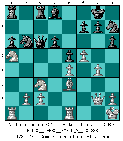 Last move : 1/2-1/2 2011 February 22 12:45:26 [Event "FICGS__CHESS__RAPID_M__000038"] [Site "FICGS"] [Date "2010.12.17"] [Round "1"] [White "Nookala,Kamesh"] [Black "Gazi,Miroslav"] [Result "1/2-1/2"] [WhiteElo "2126"] [BlackElo "2300"] 1.e4 c5 2.Nf3 d6 3.d4 cxd4 4.Nxd4 Nf6 5.Nc3 a6 6.Be3 e5 7.Nb3 Be6 8.Be2 Be7 9.O-O Nbd7 10.f4 Qc7 11.f5 Bc4 12.a4 O-O 13.a5 Rfc8 14.Bxc4 Qxc4 15.Re1 Qc6 16.Kh1 h6 17.Qf3 Bd8 18.g4 Nh7 19.Qg2 b5 20.axb6 Nxb6 21.Na5 1/2-1/2 Scott Nichols hmph! Sicilian : Najdorf, Byrne (English) attack Kingside Castling by player White (move 9) Kingside Castling by player Black (move 12) This chess game ended in a draw. Follow this game move after move (download)You sit at the board and suddenly your heart leaps. Your hand trembles to pick up the piece and move it. But what Chess teaches you is that you must sit there calmly and think about whether it's really a good idea and whether there are other better ideas. (Stanley Kubrick) Schach ist ein schwarz-weisser Dschungel. (Garry Kasparov) La vida es como un juego de Ajedrez, cambiando con cada movimiento. (Proverbio Chino) Ce n'est pas pour s'amuser qu'il joue aux échecs : il célèbre un culte. (Vladimir Nabokov) Chess is as much a mystery as women. (Purdy)