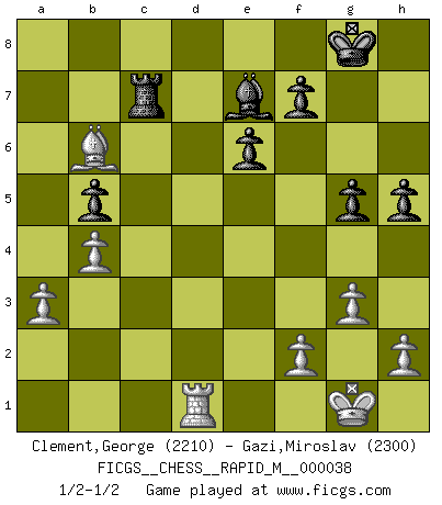 Last move : 1/2-1/2 2011 March 1 21:34:15 [Event "FICGS__CHESS__RAPID_M__000038"] [Site "FICGS"] [Date "2010.12.17"] [Round "1"] [White "Clement,George"] [Black "Gazi,Miroslav"] [Result "1/2-1/2"] [WhiteElo "2210"] [BlackElo "2300"] 1.e4 c5 2.Nc3 a6 3.Nge2 b5 4.d4 Bb7 5.dxc5 e6 6.b4 d6 7.cxd6 Bxd6 8.a3 Qc7 9.Bb2 Nc6 10.Nd4 Rd8 11.Nxc6 Bxc6 12.Qd4 Nf6 13.e5 Be7 14.Qe3 Nd7 15.Be2 O-O 16.O-O Nxe5 17.Nxb5 Bxb5 18.Bxe5 Qxc2 19.Bxb5 axb5 20.Rac1 Qf5 21.Rcd1 Rxd1 22.Rxd1 Rc8 23.g3 h5 24.Qf4 Qxf4 25.Bxf4 g5 26.Be3 Rc7 27.Bb6 1/2-1/2 Sicilian : Closed Kingside Castling by player Black (move 15) Kingside Castling by player White (move 16) This chess game ended in a draw. Follow this game move after move (download)Chess opens and enriches your mind. (Saudin Robovic) Ich hatte Angst gegen einen russischen Großmeister zu verlieren, und er befürchtete gegen einen kleinen Jungen zu verlieren. (über ein Remis gegen Juri Awerbach). (Robert James Fischer) Bobby Fischer es el jugador de Ajedrez mas grande que jamás haya existido. (Ken Smith) Horreur, mais aussi harmonie suprême : qu'y avait-il en effet au monde en dehors des échecs ? Le brouillard, l'inconnu, le non-être... (Vladimir Nabokov) Man with more than one clock never knows what time it is. (Chinese thought)