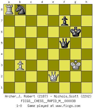 Last move : 1-0 2011 January 28 19:2:0 [Event "FICGS__CHESS__RAPID_M__000038"] [Site "FICGS"] [Date "2010.12.17"] [Round "1"] [White "Archer,J. Robert"] [Black "Nichols,Scott"] [Result "1-0"] [WhiteElo "2187"] [BlackElo "2202"] 1.d4 Nf6 2.c4 c5 3.d5 b5 4.cxb5 a6 5.bxa6 g6 6.Nc3 Bxa6 7.g3 Bg7 8.Bg2 d6 9.Nf3 Nbd7 10.Rb1 Nb6 11.b3 Bb7 12.Nh4 O-O 13.O-O Nfd7 14.Qd2 c4 15.Rd1 Qb8 16.e4 Nc5 17.Nf3 cxb3 18.axb3 Bxc3 19.Qxc3 Nxe4 20.Qd4 Bxd5 21.Bh6 Nf6 22.Bxf8 Kxf8 23.Ng5 Kg7 24.Ne4 e5 25.Qb4 Nxe4 26.Bxe4 Bxe4 27.Qxe4 d5 28.Qb4 d4 29.Ra1 Nd7 30.Qe7 Qe8 31.Qd6 Rb8 32.Ra7 Rd8 33.Ra6 h5 34.h4 Nb8 35.Qf6+ Kg8 36.Ra8 d3 37.g4 hxg4 38.h5 gxh5 39.Qg5+ Kf8 40.Qh6+ Kg8 41.Qxh5 Rd6 42.Qf5 g3 43.Rxd3 Rxd3 44.Qxd3 gxf2+ 45.Kxf2 Qc8 46.Qg3+ Kh7 47.Qh2+ Kg6 48.Qxe5 Qc2+ 49.Qe2 Qf5+ 50.Kg3 1-0 Benko gambit accepted Kingside Castling by player Black (move 12) Kingside Castling by player White (move 13) 10 pieces endgame at move 44 : White KQRP , Black KQNPPP WHITE : King + 1 Queen 1 Rook 1 Pawn BLACK : King + 1 Queen 1 Knight 3 Pawns 9 pieces endgame at move 45 : White KQRP , Black KQNPP WHITE : King + 1 Queen 1 Rook 1 Pawn BLACK : King + 1 Queen 1 Knight 2 Pawns 8 pieces endgame at move 48 : White KQRP , Black KQNP WHITE : King + 1 Queen 1 Rook 1 Pawn BLACK : King + 1 Queen 1 Knight 1 Pawn Player White won this chess game. Follow this game move after move (download)A Chess game is divided into three stages: the first, when you hope you have the advantage, the second when you believe you have an advantage, and the third... when you know you're going to lose ! (Savielly Tartakower) Verschiedene, sehr schätzbare und im Laufe des Lebens nützliche Eigenschaften des Geistes können durch das Schachspiel erworben und gekräftigt werden, so dass sie zu Gewohnheiten werden, die uns nie im Stich lassen. (Benjamin Franklin) Cuando tu no sabes absolutamente que mas hacer, es tiempo de entrar en pánico. (John van der Wiel) Tous ces prétendus hommes politiques sont les pions, les Cavaliers, les Tours ou les Fous d'une partie d'échecs qui se jouera tant qu'un hasard ne renversera pas l'échiquier. (Honoré de Balzac) Two beer, or not two beer. (Unknown)