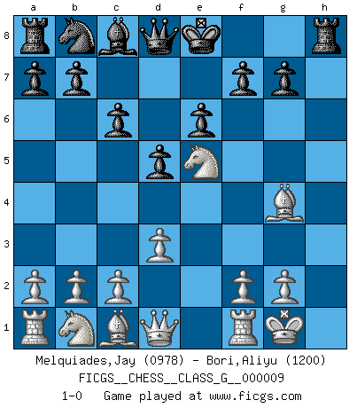 Last move : 1-0 2007 February 9 9:34:1 [Event "FICGS__CHESS__CLASS_G__000009"] [Site "FICGS"] [Date "2006.12.03"] [Round "1"] [White "Melquiades,Jay"] [Black "Bori,Aliyu"] [Result "1-0"] [WhiteElo "0978"] [BlackElo "1200"] 1.e4 d5 2.d3 e6 3.Nf3 Nf6 4.Be2 Ng4 5.O-O Bd6 6.h3 c6 7.hxg4 h5 8.e5 Bxe5 9.Nxe5 hxg4 10.Bxg4 1-0 This chess game has been lost on time (started : 2006.12.03 22:27:16) Scandinavian (centre counter) defense Kingside Castling by player White (move 5) Player White won this chess game. Follow this game move after move (download)Alekhine is a poet who creates a work of art out of something that would hardly inspire another man to send home a picture post card. (Max Euwe) Rauchen ist dem Schachspieler bei seiner Arbeit, also im Wettkampf, untersagt. (Viktor Kortschnoi) No todos los artistas son jugadores de Ajedrez, pero todos los jugadores de Ajedrez son artistas. (Marcel Duchamp) Dieu déplace le joueur, et celui-ci la pièce. Quel Dieu derrière Dieu commence donc la trame ? Arturo Perez-Reverte (prix de littérature policière 1993). The best weapon against an enemy is another enemy. (Friedrich Nietzsche)