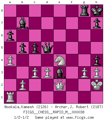 Last move : 1/2-1/2 2011 January 27 15:44:2 [Event "FICGS__CHESS__RAPID_M__000038"] [Site "FICGS"] [Date "2010.12.17"] [Round "1"] [White "Nookala,Kamesh"] [Black "Archer,J. Robert"] [Result "1/2-1/2"] [WhiteElo "2126"] [BlackElo "2187"] 1.e4 e5 2.Nf3 Nc6 3.Bb5 a6 4.Ba4 Nf6 5.O-O Be7 6.Re1 b5 7.Bb3 O-O 8.h3 Bb7 9.d3 d5 10.exd5 Nxd5 11.Nxe5 Nd4 12.Nd2 c5 13.a4 Nf4 14.Bxf7+ Rxf7 15.Nxf7 Qd5 16.Nh6+ Kh8 17.Ne4 Nxg2 18.Kxg2 gxh6 19.Bf4 Rg8+ 20.Bg3 h5 21.c3 Nf5 22.Kh2 Nxg3 23.fxg3 h4 24.Re3 Bg5 25.Qe2 Bxe3 1/2-1/2 Ruy Lopez : Closed, 7...O-O Kingside Castling by player White (move 5) Kingside Castling by player Black (move 7) This chess game ended in a draw. Follow this game move after move (download)Adequate compensation for a sacrifice is having a sound combination leading to a winning position; adequate compensation for a blunder is having your opponent snatch defeat from the jaws of victory. (Bruce A. Moon) Kasparov stellt für gewöhnlich die Regeln auf und bricht sie dann selbst wieder. (Alexej Shirov) Cuando tengo las piezas blancas, yo gano porque soy blanco; Cuando tengo las piezas negras, yo gano porque soy Bogolyubov. (Bogolyubov) Les pièces de l'échiquier étaient impitoyables. Elles le retenaient, elles l'absorbaient. Il y avait de l'horreur en cela, mais aussi une harmonie unique. Car, qu'y a-t-il dans le monde, à part les échecs ? (V. Nabokov) Better than a thousand days of diligent study is one day with a great teacher. (Japanese proverb)