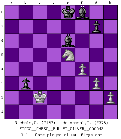 Last move : 0-1 2010 December 17 23:50:0 [Event "FICGS__CHESS__BULLET_SILVER__000042"] [Site "FICGS"] [Date "2010.12.17"] [Round "1"] [White "Nichols,Scott"] [Black "de Vassal,Thibault"] [Result "0-1"] [WhiteElo "2197"] [BlackElo "2376"] 1.e4 e6 2.d4 d5 3.Nd2 Nf6 4.e5 Nfd7 5.c3 c5 6.Bd3 Nc6 7.Ne2 cxd4 8.cxd4 f6 9.Nf4 Nxd4 10.Qh5+ Ke7 11.exf6+ Nxf6 12.Ng6+ hxg6 13.Qxh8 Kf7 14.b3 Nh5 15.O-O Nf4 16.Bb1 Qf6 17.Kh1 e5 18.g3 Nfe2 19.Bb2 Nf3 20.Bxe5 Nxe5 21.f4 Ng4 22.Nf3 Ke7 23.Bc2 Nf2+ 24.Kg2 Ne4 25.Rae1 N2c3 26.Bxe4 dxe4 27.Ne5 b5 28.Qh7 Ke8 29.Re3 b4 30.a3 a5 31.Ra1 Ra6 32.axb4 axb4 33.Rxa6 Qxa6 34.Re1 e3 35.Qxg6+ Qxg6 36.Nxg6 Bb7+ 37.Kf1 e2+ 38.Rxe2+ Nxe2 39.Kxe2 Bd5 40.Ne5 Bxb3 41.Kd2 Be6 42.Kc2 b3+ 0-1 French : Tarrasch, Closed variation Kingside Castling by player White (move 15) 10 pieces endgame at move 40 : White KNPPP , Black KBBPP WHITE : King + 1 Knight 3 Pawns BLACK : King + 2 Bishops 2 Pawns Player Black won this chess game. Follow this game move after move (download)Castle early and often. (Rob Sillars) Der Schachmeister von Heute braucht Courage, einen Killerinstinkt, Ausdauer und Arroganz. (Larry Evans) Repentinamente, me resultaba obvio en mi analisis que yo había pasado por alto lo que Fischer había visto en el tablero con la mas grande facilidad. (Mikhail Botvinnik) Un journaliste : 'Vous préférez avoir une dame de plus sur l'échiquier ou au lit ?' Boris Spassky : 'Ca dépend de la position.' Panic is a sudden desertion of us, an a going over to the enemy of our imagination. (Christian Nevell Bovee)
