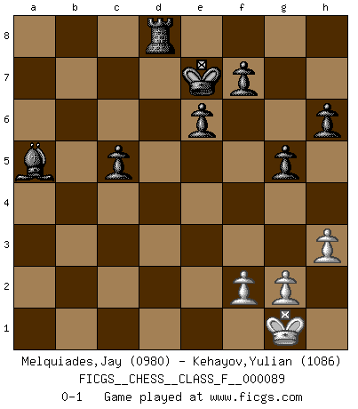 Last move : 0-1 2011 February 2 0:21:37 [Event "FICGS__CHESS__CLASS_F__000089"] [Site "FICGS"] [Date "2010.12.18"] [Round "1"] [White "Melquiades,Jay"] [Black "Kehayov,Yulian"] [Result "0-1"] [WhiteElo "0980"] [BlackElo "1086"] 1.e4 g6 2.Nf3 Bg7 3.Nc3 Nc6 4.d4 d6 5.e5 dxe5 6.Bb5 exd4 7.Nxd4 a6 8.Nxc6 axb5 9.Nb4 Nf6 10.Qxd8+ Kxd8 11.O-O e6 12.Rd1+ Bd7 13.Nxb5 c6 14.Nc3 Ke7 15.a4 Rhe8 16.Bg5 Rad8 17.Ne4 h6 18.Bh4 g5 19.Bg3 Nxe4 20.Bc7 Rc8 21.Bb6 c5 22.Nd3 Rc6 23.Ba5 b6 24.Bc3 Nxc3 25.bxc3 Bxc3 26.Rab1 Rd6 27.a5 Bxa5 28.h3 Kf8 29.Ne5 Rxd1+ 30.Rxd1 Ba4 31.Rd3 Bxc2 32.Nd7+ Ke7 33.Ne5 Bxd3 34.Nxd3 Rd8 35.Nxc5 bxc5 0-1 Robatsch (Modern) defense Kingside Castling by player White (move 11) Player Black won this chess game. Follow this game move after move (download)In Chess, at least, the brave inherit the earth. (Edmar Mednis) Ein Kibitz ist einer, der deinem Gegner gute Ratschläge gibt. (Andrew Soltis) No es una movida, aún la mejor movida que tu debas buscar, sino un plan comprensible. (Eugene Znosko-Borovsky) Ce qui caractérise les parties de combat, c'est que si le défenseur a constamment de difficiles problèmes à résoudre, l'attaquant doit chercher sans relâche de nouvelles possibilités d'attaque. (Koblentz) Waiting for chance ? Play in casinos. (FICGS proverb)