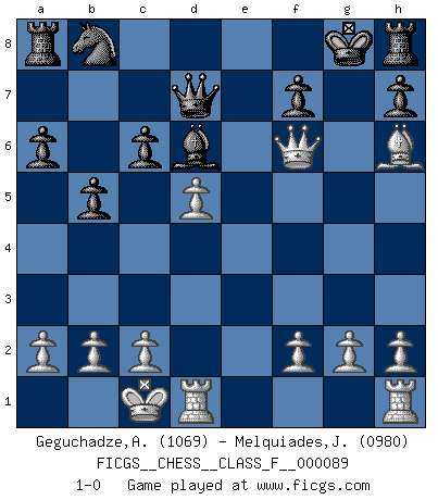 Last move : 1-0 2011 January 27 18:24:13 [Event "FICGS__CHESS__CLASS_F__000089"] [Site "FICGS"] [Date "2010.12.18"] [Round "1"] [White "Geguchadze,Alexander"] [Black "Melquiades,Jay"] [Result "1-0"] [WhiteElo "1069"] [BlackElo "0980"] 1.e4 e5 2.Nf3 a6 3.Nxe5 Qe7 4.d4 d6 5.Nf3 Qxe4+ 6.Be3 Bg4 7.Nbd2 Qe6 8.Be2 Nf6 9.Ng5 Qd7 10.Nge4 Bxe2 11.Nxf6+ gxf6 12.Qxe2 Be7 13.d5 c6 14.Nc4 Bd8 15.O-O-O b5 16.Bf4 Be7 17.Nxd6+ Kf8 18.Bh6+ Kg8 19.Qf3 Bxd6 20.Qxf6 1-0 King's knight Opening Queenside Castling by player White (move 15) Player White won this chess game. Follow this game move after move (download)As one by one I mowed them down, my superiority soon became apparent. (Jose Capablanca) Ich würde mich als ganz normalen Jungen bezeichnen [Im Alter von 12]. (Sergej Karjakin) El Ajedrez es una manera fabulosa para que los niños aprendan a autovalorarse y a autoestimarse. (Saudin Robovic) Même un GMI sait rarement calculer sur plus de cinq coups une attaque à sacrifices. (Rudolf Spielmann) I feel so... helpless. (C-3PO in Star Wars ep.3)