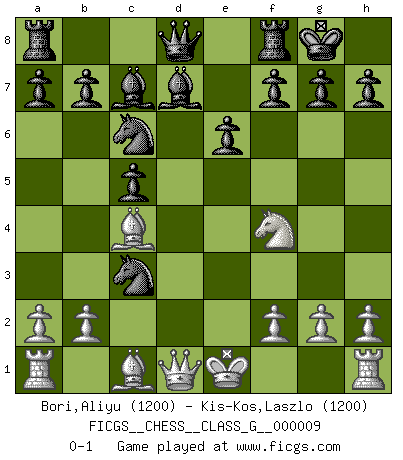 Last move : 0-1 2007 February 27 5:56:42 [Event "FICGS__CHESS__CLASS_G__000009"] [Site "FICGS"] [Date "2006.12.03"] [Round "1"] [White "Bori,Aliyu"] [Black "Kis-Kos,Laszlo"] [Result "0-1"] [WhiteElo "1200"] [BlackElo "1200"] 1.d4 d5 2.c3 Nf6 3.e3 e6 4.c4 c5 5.Qa4+ Bd7 6.Qd1 Nc6 7.Nh3 Bd6 8.Qa4 Nxd4 9.Qd1 Nc6 10.Bd3 O-O 11.e4 dxc4 12.Bxc4 Bc7 13.Nf4 Nxe4 14.Nc3 Nxc3 0-1 This chess game has been lost on time (started : 2006.12.03 22:27:16) Queen's pawn game Kingside Castling by player Black (move 10) Player Black won this chess game. Follow this game move after move (download)The tactician knows what to do when there is something to do; whereas the strategian knows what to do when there is nothing to do. (Gerald Abrahams) Schach verlangt totale Konzentration. (Robert James Fischer) Siempre es mejor sacrificar los hombres de tu oponente. (Savielly Tartakower) Le thème de l'attaque double intervient d'une manière ou d'une autre dans l'immense majorité des combinaisons. (Youri Averbakh) Experience is the name we all give to our mistakes. (Oscar Wilde)