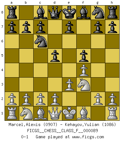 Last move : 0-1 2010 December 24 7:30:19 [Event "FICGS__CHESS__CLASS_F__000089"] [Site "FICGS"] [Date "2010.12.18"] [Round "1"] [White "Marcel,Alexis"] [Black "Kehayov,Yulian"] [Result "0-1"] [WhiteElo "0907"] [BlackElo "1086"] 1.f4 d5 2.Nf3 f5 3.e3 Nc6 0-1 Bird's Opening Player Black won this chess game. Follow this game move after move (download)To avoid losing a piece, many a person has lost the game. (Savielly Tartakover) Auf Remis zu spielen ist gewissermaßen ein Verbrechen gegen das Schachspiel. (Mikhail Nekhemyevich Tal) Solo puedes ser bueno en el Ajedrez si amas al juego. (Bobby Fischer) Horreur, mais aussi harmonie suprême : qu'y avait-il en effet au monde en dehors des échecs ? Le brouillard, l'inconnu, le non-être... (Vladimir Nabokov) War is the child of passion, passion is the child of narcissism and narcissism is the child. (...) Another game ? (Thibault de Vassal)