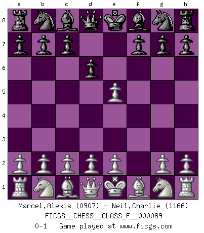 Last move : 0-1 2010 December 24 7:30:5 [Event "FICGS__CHESS__CLASS_F__000089"] [Site "FICGS"] [Date "2010.12.18"] [Round "1"] [White "Marcel,Alexis"] [Black "Neil,Charlie"] [Result "0-1"] [WhiteElo "0907"] [BlackElo "1166"] 1.f4 e5 2.fxe5 d6 0-1 Bird : From gambit Player Black won this chess game. Follow this game move after move (download)I'd rather have a Pawn than a finger. (Reuben Fine) Man kann eine Schachpartie nur gewinnen, wenn das Gleichgewicht gestört ist. In einer Stellung mit ungestörtem Gleichgewicht ist auch das größte Genie hilflos - in der Stellung steckt dann eben kein genialer Einfall. (Wilhelm Steinitz) El Ajedrez hace al hombre ser mas sabio y ver mas claro. (Vladimir Putin) J'apprécie les joueurs d'est-indienne, c'est grâce à eux que je nourris ma famille depuis tant d'années. (Petrosian) No enterprise is more likely to succeed than one concealed from the enemy until it is ripe for execution. (Niccolo Machiavelli)