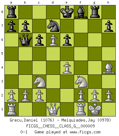 Last move : 0-1 2006 December 18 17:44:24 [Event "FICGS__CHESS__CLASS_G__000009"] [Site "FICGS"] [Date "2006.12.03"] [Round "1"] [White "Grecu,Daniel"] [Black "Melquiades,Jay"] [Result "0-1"] [WhiteElo "1076"] [BlackElo "0978"] 1.e4 e5 2.Nf3 d6 3.Nc3 c6 4.Bc4 Be6 5.Bxe6 fxe6 6.O-O g5 7.d4 Nf6 8.Bxg5 Rg8 9.dxe5 Qb6 10.Bxf6 Nd7 11.Bh4 Nc5 12.exd6 Nd7 0-1 Philidor's defense Kingside Castling by player White (move 6) Player Black won this chess game. Follow this game move after move (download)I have always a slight feeling of pity for the man who has no knowledge of Chess. (Siegbert Tarrasch) Jeder Schachmeister war einmal ein Anfänger. (Irving Chernev) Nunca nadie ha ganado una partida de Ajedrez rindiendose. (Unknown) La solitude du joueur d'Echecs à l'approche du mat est semblable à celle du condamné. (Francis Szpiner) Wawaweewa ! (Borat: Cultural learnings of America for make benefit glorious nation of Kazakhstan)