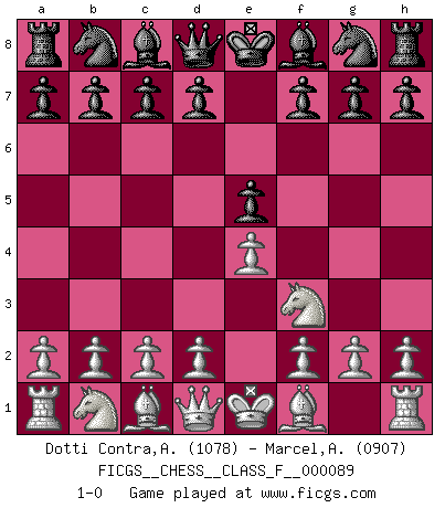 Last move : 1-0 2010 December 24 7:30:23 [Event "FICGS__CHESS__CLASS_F__000089"] [Site "FICGS"] [Date "2010.12.18"] [Round "1"] [White "Dotti Contra,Alessandro"] [Black "Marcel,Alexis"] [Result "1-0"] [WhiteElo "1078"] [BlackElo "0907"] 1.e4 e5 2.Nf3 1-0 King's knight Opening Player White won this chess game. Follow this game move after move (download)Bobby is the most misunderstood, misquoted celebrity walking the face of this earth. (Yasser Seirawan) Am wohlsten fühle ich mich, wenn ich sehe, wie sich mein Gegner im Todeskampf windet. (Robert James Fischer) Repentinamente, me resultaba obvio en mi analisis que yo había pasado por alto lo que Fischer había visto en el tablero con la mas grande facilidad. (Mikhail Botvinnik) Roi des jeux et jeu des rois, les échecs portent en eux un sentiment d'infini. Ils donnent à celui qui s'est efforcé d'en approfondir les arcanes l'impression de n'être pas à la mesure de l'homme; en fait, ils constituent un résumé de l'univers, un microcosme, et figurent cette grande échelle qui, dans les plans de la lumière descend jusqu'à la matière, qui des abîmes insondables remonte jusqu'en l'infini de Dieu. (Pyrame) Is not life a hundred times too short to bore ourselves ? (Friedrich Nietzsche)