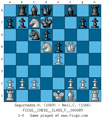 Last move : 1-0 2011 January 7 9:48:59 [Event "FICGS__CHESS__CLASS_F__000089"] [Site "FICGS"] [Date "2010.12.18"] [Round "1"] [White "Geguchadze,Alexander"] [Black "Neil,Charlie"] [Result "1-0"] [WhiteElo "1069"] [BlackElo "1166"] 1.e4 c5 2.Nf3 d6 3.d4 cxd4 4.Nxd4 Nf6 5.Nc3 Nc6 6.Bg5 e5 7.Bxf6 Qxf6 8.Nd5 Qd8 9.Nb5 Rb8 10.Nbc7+ Kd7 11.Qg4+ f5 12.Qxf5+ 1-0 Sicilian : Richter-Rauzer Player White won this chess game. Follow this game move after move (download)In a gambit you give up a Pawn for the sake of getting a lost game. (Samuel Standige Boden) Ich trinke, ich rauche, ich spiele, ich liebe Frauen aber Fernschach ist ein Laster, das ich nicht habe. (Mikhail Nekhemyevich Tal) Si un gobernante no entiende al Ajedrez, ¿como puede governar él un reinado?. (El Rey Khusros II) Les échecs c'est le défi de l'alpiniste, toujours plus haut, prêt à tout pour monter à l'assaut du Roi ennemi. Les échecs, c'est de la musique en mouvement, un ballet majestueux pour les yeux. C'est de la poésie composée par les fantômes du passé qui au même titre que Rimbaud ou Verlaine méritent notre admiration. Les échecs, c'est de la peinture ou le moindre mouvement modifie le tableau pour en faire un Picasso ou un Van Gogh. Les échecs, c'est tout et rien, c'est la vie et la mort. Jjulie33 sur le forum de France-Echecs. If we knew what we were doing, we would not call it research. (Albert Einstein)