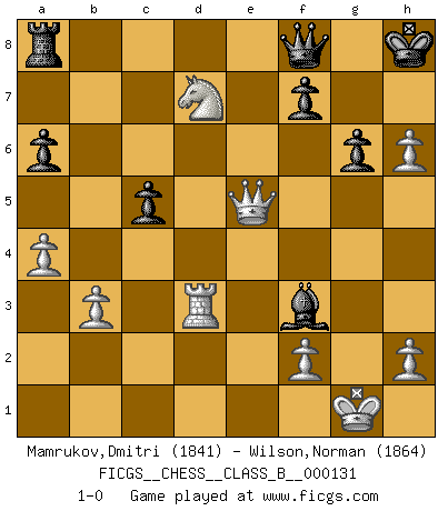 Last move : 1-0 2011 February 1 14:49:29 [Event "FICGS__CHESS__CLASS_B__000131"] [Site "FICGS"] [Date "2010.12.19"] [Round "1"] [White "Mamrukov,Dmitri"] [Black "Wilson,Norman"] [Result "1-0"] [WhiteElo "1841"] [BlackElo "1864"] 1.d4 Nf6 2.c4 g6 3.g3 Bg7 4.Bg2 O-O 5.Nc3 d6 6.Nf3 Nc6 7.O-O a6 8.Qd3 Nd7 9.Be3 e5 10.Qd2 exd4 11.Nxd4 Nde5 12.b3 Bd7 13.Nxc6 Nxc6 14.Rfd1 Bg4 15.Bh6 Bxh6 16.Qxh6 Re8 17.Qf4 Bxe2 18.Re1 Bd3 19.Bxc6 Rxe1+ 20.Rxe1 bxc6 21.g4 d5 22.cxd5 cxd5 23.Rd1 Bb5 24.Nxd5 Qh4 25.Qd4 c5 26.Nf6+ Kh8 27.Qe5 Qh6 28.a4 Bc6 29.g5 Qf8 30.Rd3 h6 31.gxh6 Bf3 32.Nd7 1-0 King's Indian : 3.g3 Kingside Castling by player Black (move 4) Kingside Castling by player White (move 7) Player White won this chess game. Follow this game move after move (download)Only the player with the initiative has the right to attack. (Wilhelm Steinitz) Ich las kürzlich ein Buch von Nietzsche. Er sagte Religion verdumme nur die Menschen. Ich stimme zu. (Robert James Fischer) Cuando le juegas a Fischer, no es una cuestion de si vas a ganar o perder. Es una cuestion de si vas a sobrevivir. (Boris Spassky) Les Cavaliers se révèlent fort utiles dans les positions fermées. D'habitude, les Fous sont un peu plus forts que les Cavaliers dans les positions ouvertes. Qu'on le veuille ou non, il restera toujours des exceptions ! The worth of a book is to be measured by what you can carry away from it. (James Bryce)