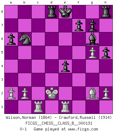 Last move : 0-1 2011 February 25 10:46:43 [Event "FICGS__CHESS__CLASS_B__000131"] [Site "FICGS"] [Date "2010.12.19"] [Round "1"] [White "Wilson,Norman"] [Black "Crawford,Russell"] [Result "0-1"] [WhiteElo "1864"] [BlackElo "1914"] 1.d4 d5 2.c4 c6 3.Nf3 Nf6 4.cxd5 cxd5 5.Nc3 Nc6 6.Bf4 a6 7.Ne5 Qb6 8.Nxc6 bxc6 9.Qd2 Bf5 10.f3 e6 11.g4 Bg6 12.Bg2 Nd7 13.e4 c5 14.Be3 dxe4 15.Nd5 exd5 16.fxe4 dxe4 17.Rc1 h5 18.g5 cxd4 19.Bxd4 Bb4 20.Bxb6 Bxd2+ 21.Kxd2 Nxb6 22.Rhe1 Rd8+ 0-1 QGD Slav : Exchange variation Player Black won this chess game. Follow this game move after move (download)Every Chess master was once a beginner. (Chernev) Mein erstes Ziel war nicht, die Partie zu gewinnen, sondern eine Figur zu opfern. -- der junge (Wilhelm Steinitz) No hay otro maestro que tenga una voluntad terrífica de ganar. Al tablero, el irradía peligro y aún los oponentes mas fuertes tienden a congelarse como liebres cuando olfatean a una pantera. Aún sus debilidades son peligrosas. Con las blancas, su juego de apertura es predecible - te es posible hacer planes en su contra - pero es tan fuerte que tus planes casi nunca funcionan. En el juego medio, su precisión e invención son fabulosas y en finales, tú simplemente no le puedes vencer. (Experto Alemán anónimo) Votre seul travail dans les ouvertures est d'obtenir un milieu de partie jouable. (Lajos Portish) A cynic is a man who knows the price of everything but the value of nothing. (Oscar Wilde)