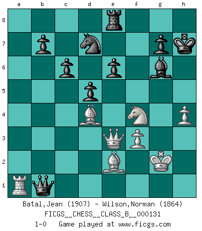 Last move : 1-0 2011 February 9 8:53:23 [Event "FICGS__CHESS__CLASS_B__000131"] [Site "FICGS"] [Date "2010.12.19"] [Round "1"] [White "Batal,Jean"] [Black "Wilson,Norman"] [Result "1-0"] [WhiteElo "1907"] [BlackElo "1864"] 1.Nf3 Nf6 2.g3 d5 3.Bg2 Bf5 4.O-O e6 5.d3 h6 6.Nbd2 Nbd7 7.b3 Be7 8.Bb2 O-O 9.Qe1 Bg6 10.e4 c6 11.Qe2 dxe4 12.dxe4 Qc7 13.h3 a5 14.e5 Nd5 15.Ne4 a4 16.c4 axb3 17.cxd5 exd5 18.Nc3 bxa2 19.Rxa2 Rxa2 20.Nxa2 Re8 21.Rd1 Bc5 22.Nc1 Qb6 23.Nd3 Qa6 24.Bf1 Bb6 25.Ra1 Qb5 26.Qd2 Be4 27.Nd4 Bxd4 28.Bxd4 Qb3 29.Qe3 Bg6 30.Ra7 Qb1 31.Kg2 Kh7 32.Be2 Be4+ 33.f3 Bf5 34.g4 Bg6 35.h4 h5 36.gxh5 Bxh5 37.Nf4 Bg6 38.e6 fxe6 39.Ra1 1-0 Reti Opening Kingside Castling by player White (move 4) Kingside Castling by player Black (move 8) Player White won this chess game. Follow this game move after move (download)It's just you and your opponent at the board and you're trying to prove something. (Bobby Fischer) Ich spiele ehrlich und spiele, um zu gewinnen. Wenn ich verliere nehme ich meine Medizin. (Robert James Fischer) Los asuntos humanos son como una partida de Ajedrez: solo aquellos que no lo toman seriamente, pueden ser llamados buenos jugadores. (Hung Tzu Ch'eng) La solitude du joueur d'Echecs à l'approche du mat est semblable à celle du condamné. (Francis Szpiner) All men can see these tactics whereby I conquer, but what none can see is the strategy out of which victory is evolved. (Sun Tzu)