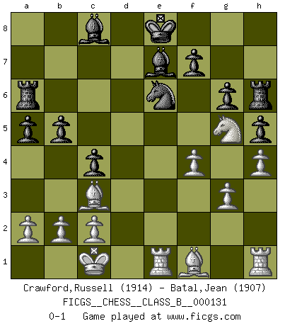 Last move : 0-1 2011 May 1 5:6:15 [Event "FICGS__CHESS__CLASS_B__000131"] [Site "FICGS"] [Date "2010.12.19"] [Round "1"] [White "Crawford,Russell"] [Black "Batal,Jean"] [Result "0-1"] [WhiteElo "1914"] [BlackElo "1907"] 1.e4 d6 2.d4 Nf6 3.Nc3 Nbd7 4.f4 e5 5.Nf3 exd4 6.Qxd4 c6 7.Bd2 Qb6 8.O-O-O Qxd4 9.Nxd4 Nc5 10.Re1 Ne6 11.Nf5 g6 12.Nxd6+ Bxd6 13.e5 Be7 14.exf6 Bxf6 15.Ne4 Be7 16.h4 h5 17.Bc3 Rh6 18.Ng5 b5 19.g3 a5 20.Bg2 Ra6 21.Bh3 c5 22.Bf1 c4 0-1 Pirc defense Queenside Castling by player White (move 8) Player Black won this chess game. Follow this game move after move (download)Nonsense was the last thing Fischer was interested in, as far as Chess was concerned. (Elie Agur) Sie führen leise Selbstgespräche, schlürfen lautstark ihre Getränke, schmatzen hörbar beim Essen, blasen ihrem Gegenüber Rauch in die Augen, niesen ihm ins Gesicht, starren ihn unverwandt an, bis er sich unter ihren Blicken windet, rutschen ständig auf ihrem Stuhl hin und her, rülpsen und bohren in der Nase. (Anonymous) Un juego de Ajedrez es un dialogo, una conversación entre un jugador y su oponente. Cada movimiento del oponente puede contener amenazas o tropiezos, pero un jugador no se puede defender de las amenazas o tomar ventaja de los tropiezos si es que no se pregunta a sí mismo: ¿Que es lo que mi oponente va a hacer después de cada movida?. (Bruce A. Moon) Les Echecs sont et restent toujours un combat, un combat intégral comme la boxe, la lutte ou un autre sport, et où il doit y avoir un vainqueur et un vaincu. (Joseph Emil Diemer) The best teachers teach from the heart, not from the book. (Author unknown)