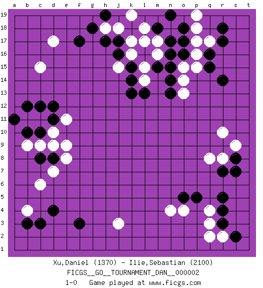 Last move : 1-0 2007 March 30 3:15:45 [Event "FICGS__GO__TOURNAMENT_DAN__000002"] [Site "FICGS"] [Date "2006.12.04"] [Round "1"] [Black "Xu,Daniel"] [White "Ilie,Sebastian"] [Result "1-0"] [Rating 1 "1370"] [Rating 2 "2100"] 1.q16 d17 2.d4 q3 3.r5 q8 4.p5 o4 5.o5 n4 6.r3 r2 7.s2 q4 8.r4 q2 9.r7 r8 10.s8 s9 11.s7 r10 12.r14 c6 13.f3 b4 14.c3 d10 15.c8 d7 16.c10 c11 17.d8 e8 18.d11 e9 19.c12 b11 20.b12 e11 21.d12 c9 22.b10 b9 23.a11 d9 24.f17 c15 25.j17 j3 26.b3 p18 27.r18 q17 28.r17 p16 29.q15 l17 30.n17 n18 31.o17 p17 32.m18 m17 33.o18 l18 34.n19 o15 35.n15 o13 36.n14 o14 37.n13 p19 38.o16 p15 39.k15 j18 40.h17 h18 41.g18 m16 42.n16 l15 43.k14 k16 44.j16 l14 45.l13 k17 46.m15 k19 47.h19 j15 48.k13 1-0 This go game has been lost on time (started : 2006.12.04 22:28:52) Here are the names of the openings (joseki) played in the four corners : Corner q4 : q3 r5 Komoku (Somok, Xiao~mu`) 3-4 Point. The komoku (3-4) point is the traditional corner enclosure move.. Ikken Kakari (Hankan Keolch'im, Yi Gua`jiao~, 1-Space Low Pincer). The small knight move is the basic approach move to the 3-4 point stone. It has been continually used for over four centuries. There are limitless variations, with new moves constantly being discovered. Black 2 opens the door to a treaure store of joseki. Corner d4 : d4 c6 Hoshi (Hwajeom, Seongjeom, Xingwei`) 4-4 Point. The star or hoshi (4-4) point, emphasizing influence at the potential expense of territory. Ikken Kakari (Hankan Keolch'im, Yi Gua`jiao~, 1-Space Low Approach). White 2 is the standard approach move to the 4-4. Player Black won this Go (weiqi, baduk) game. Follow this game move after move (download)Strange things happen at the one-two points. (Anonymous) A shortcut is the longest distance between two points. (Don Groves)