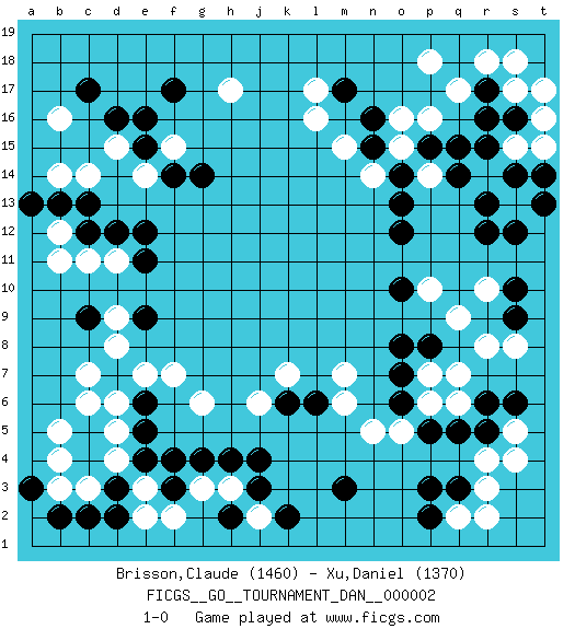 Last move : 1-0 2007 February 16 12:52:22 [Event "FICGS__GO__TOURNAMENT_DAN__000002"] [Site "FICGS"] [Date "2006.12.04"] [Round "1"] [Black "Brisson,Claude"] [White "Xu,Daniel"] [Result "1-0"] [Rating 1 "1460"] [Rating 2 "1370"] 1.d16 r4 2.d3 q17 3.p3 q6 4.m3 r10 5.c9 c14 6.f17 b16 7.c17 c11 8.e9 d5 9.c5 c6 10.c4 g6 11.f4 f7 12.e6 e7 13.d7 d6 14.e5 d8 15.d12 c7 16.c12 b12 17.b13 b11 18.c13 d11 19.e11 d9 20.e12 l17 21.q15 o16 22.r17 r18 23.r16 p18 24.r12 p10 25.j4 g3 26.g4 h3 27.j3 b14 28.a13 j2 29.k2 e2 30.d2 e3 31.e4 d4 32.f3 f2 33.h4 c3 34.c2 b3 35.b2 b5 36.a3 b4 37.h2 e14 38.f14 s13 39.r13 s15 40.s12 s17 41.s16 t16 42.s14 r14 43.t13 t15 44.t14 t17 45.r15 s18 46.o12 f15 47.e15 d15 48.e16 h17 49.g14 q2 50.m17 l16 51.n15 p14 52.p15 o15 53.o14 n14 54.o13 m15 55.n16 p16 56.q14 r8 57.o6 j6 58.q3 r3 59.p2 r2 60.k6 k7 61.l6 o5 62.p5 p6 63.q5 m6 64.r5 s5 65.s6 s4 66.r6 n5 67.o7 p7 68.p8 q7 69.o8 m7 70.o10 q9 71.s9 s8 72.s10 1-0 Here are the names of the openings (joseki) played in the four corners : Corner q4 : r4 p3 Komoku (Somok, Xiao~mu`) 3-4 Point. The komoku (3-4) point is the traditional corner enclosure move.. Ikken Kakari (Hankan Keolch'im, Yi Gua`jiao~, 1-Space Low Pincer). The small knight move is the basic approach move to the 3-4 point stone. It has been continually used for over four centuries. There are limitless variations, with new moves constantly being discovered. Black 2 opens the door to a treaure store of joseki. Corner d16 : d16 c14 Hoshi (Hwajeom, Seongjeom, Xingwei`) 4-4 Point. The star or hoshi (4-4) point, emphasizing influence at the potential expense of territory. Ikken Kakari (Hankan Keolch'im, Yi Gua`jiao~, 1-Space Low Approach). White 2 is the standard approach move to the 4-4. Player Black won this Go (weiqi, baduk) game. Follow this game move after move (download)Keep sente in the opening. A premature attack loses sente. (Anonymous) Wisdom begins at the end. (Daniel Webster)