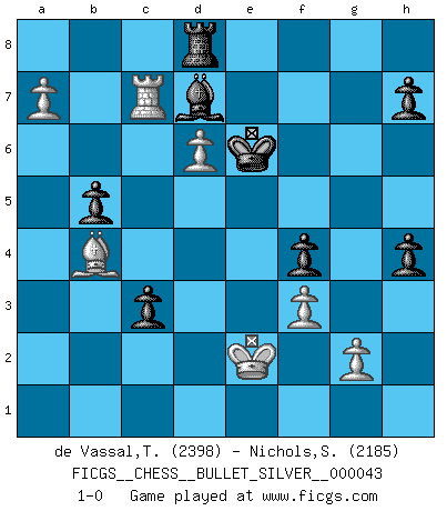 Last move : 1-0 2010 December 20 19:23:43 [Event "FICGS__CHESS__BULLET_SILVER__000043"] [Site "FICGS"] [Date "2010.12.20"] [Round "1"] [White "de Vassal,Thibault"] [Black "Nichols,Scott"] [Result "1-0"] [WhiteElo "2398"] [BlackElo "2185"] 1.d4 d5 2.c4 e6 3.Nc3 Nf6 4.Bg5 Nbd7 5.Nf3 Bb4 6.cxd5 exd5 7.e3 c5 8.Bd3 Qa5 9.Qc2 c4 10.Bf5 O-O 11.O-O Re8 12.Nd2 g6 13.Bxd7 Nxd7 14.e4 Bxc3 15.Qxc3 Qxc3 16.bxc3 Nb6 17.f3 Bd7 18.Rab1 Re6 19.Bh6 f6 20.exd5 Nxd5 21.Rxb7 Bc6 22.Rg7+ Kh8 23.Ne4 g5 24.Nc5 R6e8 25.Rc1 Rg8 26.Rxg8+ Kxg8 27.h4 gxh4 28.Ne4 Rd8 29.Rb1 f5 30.Bg5 Rf8 31.Nd6 Nxc3 32.Rb2 Nb5 33.Nxb5 Rb8 34.d5 Bd7 35.a4 a6 36.Re2 axb5 37.Re7 Be8 38.a5 Ra8 39.d6 Bc6 40.Bd2 Rd8 41.Bb4 c3 42.Rc7 Bd7 43.Kf2 Kf7 44.a6 Ke6 45.a7 f4 46.Ke2 1-0 QGD : 4.Bg5 Nbd7 Kingside Castling by player Black (move 10) Kingside Castling by player White (move 11) Player White won this chess game. Follow this game move after move (download)The boy (then a 12 year old boy named Anatoly Karpov) doesn't have a clue about Chess, and there's no future at all for him in this profession. (Mikhail Botvinnik) Das Schachspiel hat wie die Liebe, die Musik, die Fähigkeit, den Menschen glücklich zu machen. Ich habe ein leises Gefühl des Bedauerns für jeden, der das Schachspiel nicht kennt, so wie ich jeden bedaure, der die Liebe nicht kennt. (Siegbert Tarrasch) El Ajedrez es un regaderazo frío para la mente. (Sir John Simon) On n'a jamais que l'âge auquel on a commence à jouer aux échecs car après on cesse de vieillir. (Capablanca) May the force be with you. (Han Solo in Star Wars ep.4)