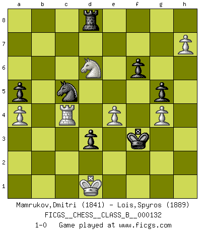 Last move : 1-0 2011 May 6 15:21:14 [Event "FICGS__CHESS__CLASS_B__000132"] [Site "FICGS"] [Date "2010.12.21"] [Round "1"] [White "Mamrukov,Dmitri"] [Black "Lois,Spyros"] [Result "1-0"] [WhiteElo "1841"] [BlackElo "1889"] 1.d4 d5 2.c4 e6 3.Nf3 Nf6 4.g3 dxc4 5.Bg2 c5 6.O-O Nc6 7.dxc5 Qxd1 8.Rxd1 Bxc5 9.Nbd2 c3 10.bxc3 O-O 11.Nb3 Be7 12.Bb2 Bd7 13.c4 Rfd8 14.Nfd4 Rac8 15.Nb5 Nb4 16.Nd6 Bxd6 17.Rxd6 Ne8 18.Rd2 Bc6 19.Rxd8 Rxd8 20.a3 Na6 21.Bxc6 bxc6 22.Bd4 Rd7 23.f3 f6 24.Bf2 Kf7 25.c5 e5 26.Na5 Nec7 27.Rc1 Ne6 28.Nxc6 Rc7 29.Nb4 Naxc5 30.Nd5 Rc8 31.e4 Rc6 32.Rc4 g5 33.g4 h6 34.h3 Rc8 35.a4 a5 36.h4 Nd4 37.Bxd4 exd4 38.h5 Ke6 39.Kf1 d3 40.Ke1 Rc6 41.Ne3 Ke5 42.Nf5 Rc7 43.Nxh6 Kf4 44.Nf5 Kxf3 45.h6 Kf4 46.Ng7 Ke3 47.Kd1 Rc8 48.Nf5+ Kf3 49.Nd6 Rd8 50.h7 1-0 Queen's gambit declined Kingside Castling by player White (move 6) Kingside Castling by player Black (move 10) Player White won this chess game. Follow this game move after move (download)Openings teach you openings. Endgames teach you chess ! (Stephan Gerzadowicz) Es hat in meinem Leben Zeiten gegeben, in denen das Schachspiel, wenn nicht zum Lebenszweck, so doch zu einem regelrechten Lebensersatz geworden ist. Man fühlt sich in solchen Zeiten nicht so, als besäße man eine göttliche Gabe, sondern eher so, als sei man von ihr besessen. (Garry Kasparov) EL Ajedrez es como la vida. (Boris Spassky) La victoire dans une partie d'Echecs appartient la plupart du temps à celui qui voit un peu plus loin que l'adversaire. (Lasker) There's always a bigger fish. (Qui-Gon Jinn in Star Wars ep.1)
