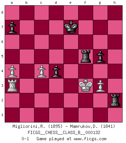 Last move : 0-1 2011 April 18 20:48:45 [Event "FICGS__CHESS__CLASS_B__000132"] [Site "FICGS"] [Date "2010.12.21"] [Round "1"] [White "Migliorini,Roberto"] [Black "Mamrukov,Dmitri"] [Result "0-1"] [WhiteElo "1895"] [BlackElo "1841"] 1.b3 e5 2.Bb2 Nc6 3.c4 Nf6 4.e3 d5 5.cxd5 Nxd5 6.a3 Bd6 7.Qc2 O-O 8.Nf3 Qe7 9.Nc3 Be6 10.Bb5 Nxc3 11.Qxc3 f6 12.O-O e4 13.Bxc6 bxc6 14.Nd4 c5 15.Nxe6 Qxe6 16.Qc4 Kf7 17.Bc3 Qxc4 18.bxc4 Rab8 19.f3 exf3 20.Rxf3 Rfe8 21.a4 Re4 22.Rh3 h6 23.d3 R4e8 24.Ra3 Rb1+ 25.Kf2 Reb8 26.e4 Rc1 27.Kf3 Rc2 28.g3 Rb1 29.Ke3 Rg1 30.e5 Bxe5 31.Bxe5 Re1+ 32.Kf3 Rxe5 33.Rh4 g5 34.Rxh6 f5 35.Rc6 Rxh2 36.Rxc7+ Ke6 37.Rc6+ Kd7 38.Rf6 Ke7 39.d4 cxd4 40.Rxf5 Rxf5+ 0-1 Nimzovich-Larsen attack : Modern variation Kingside Castling by player Black (move 7) Kingside Castling by player White (move 12) Player Black won this chess game. Follow this game move after move (download)Live, lose, and learn, by observing your opponent how to win. (Amber Steenbock) Die meiste Zeit treffe ich auf Gegner, die meine Enkel sein könnten. Ich bin da, um ihnen zu zeigen, dass sie von mir noch einiges lernen können. (Viktor Kortschnoi) Combinaciones deslumbrantes son para la mayoría, mover madera es para los pocos. (Georg Kieninger) Le joueur d'Echecs qui veut atteindre le top est obligé de développer son propre credo créatif. Alexeï Stepanovicth Souétine. Il est facile d'écrire des livres ! Ce qui est difficile, c'est de jouer ! (Alexeï Stepanovicth Souétine) The only difference between a tax man and a taxidermist is that the taxidermist leaves the skin. (Mark Twain)