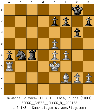 Last move : 1/2-1/2 2011 April 11 11:37:11 [Event "FICGS__CHESS__CLASS_B__000132"] [Site "FICGS"] [Date "2010.12.21"] [Round "1"] [White "Skwarczylo,Marek"] [Black "Lois,Spyros"] [Result "1/2-1/2"] [WhiteElo "1942"] [BlackElo "1889"] 1.d4 Nf6 2.Nf3 g6 3.c4 Bg7 4.Nc3 d5 5.cxd5 Nxd5 6.e4 Nxc3 7.bxc3 c5 8.Be3 Qa5 9.Qd2 O-O 10.Rc1 Bg4 11.Ne5 Bxe5 12.dxe5 Nc6 13.f4 Rfd8 14.Qc2 Rac8 15.Kf2 b5 16.a4 bxa4 17.Ra1 Rb8 18.Bc4 a3 19.Ra2 Qb6 20.Rxa3 Na5 21.Bd3 Rxd3 22.Qxd3 Qb2+ 23.Kg3 Qxa3 24.Kxg4 Nc6 25.Rf1 Rb3 26.Qd5 Qa6 27.Rf3 Rxc3 28.Bxc5 Rc2 29.Kg3 Qb5 30.Bf2 Qc4 31.Qxc4 Rxc4 32.Ra3 a5 33.Kf3 a4 34.Ke3 Nb4 1/2-1/2 King's Indian : East Indian defense Kingside Castling by player Black (move 9) This chess game ended in a draw. Follow this game move after move (download)Some part of a mistake is always correct. (Savielly Tartakover) Taktik ist was man tun muß, wenn etwas zu tun ist. Strategie ist was man tun muß, wenn nichts zu tun ist. (Savielly Grigorievitsch Tartakower) El ganador de una partida es aquel jugador que hace el penúltimo error. (Savielly Tartakover) Il a essayé de se convaincre qu'il pourrait empêcher toutes les erreurs et ne jamais perdre. L'horreur ! Gary Kasparov au sujet de Robert Fischer. Art is not a thing, it is a way. (Elbert Hubbard)