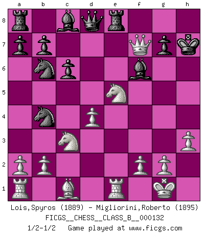 Last move : 1/2-1/2 2011 February 26 22:39:46 [Event "FICGS__CHESS__CLASS_B__000132"] [Site "FICGS"] [Date "2010.12.21"] [Round "1"] [White "Lois,Spyros"] [Black "Migliorini,Roberto"] [Result "1/2-1/2"] [WhiteElo "1889"] [BlackElo "1895"] 1.d4 d5 2.c4 dxc4 3.e3 e5 4.Bxc4 exd4 5.exd4 Nf6 6.Nc3 Be7 7.Nf3 O-O 8.O-O Nbd7 9.Re1 Nb6 10.Bb3 c6 11.Ne5 Nfd5 12.Bc2 Nb4 13.Bb1 N4d5 14.h3 Bf6 15.Bd3 Re8 16.Qf3 Nb4 17.Bxh7+ Kxh7 18.Qh5+ Kg8 19.Qxf7+ Kh7 1/2-1/2 Queen's gambit accepted Kingside Castling by player Black (move 7) Kingside Castling by player White (move 8) This chess game ended in a draw. Follow this game move after move (download)Chess mastery essentially consists of analyzing Chess positions accurately. (Mikhail Botvinnik) Meine Liebe ist Schach, Schach, Schach. Ich muss jeden Tag Schach spielen, deshalb fühle ich mich so stark. (Miguel Najdorf) No soy una persona materialista y por eso, no resiento la falta o pérdida del dinero. La ausencia de cosas mundanas carece de importancia. Ya que el Ajedrez es una forma en la que puedo ser tan materialista como yo desee sin tener la necesidad de vender mi alma. (Jamie Walter Adams) Les échecs sont utiles à l'exercice de la faculté de penser et à celle de l'imagination. Car nous devons posséder une méthode élaborée pour atteindre des buts partout où nous devons conduire notre raison. (Leibnitz) The various flowers seem good to different people. (Chinese proverb)