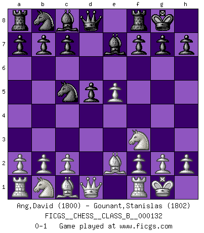 Last move : 0-1 2011 January 5 0:57:13 [Event "FICGS__CHESS__CLASS_B__000132"] [Site "FICGS"] [Date "2010.12.21"] [Round "1"] [White "Ang,David"] [Black "Gounant,Stanislas"] [Result "0-1"] [WhiteElo "1800"] [BlackElo "1802"] 1.e4 e5 2.Nf3 Nf6 3.d4 Nxe4 4.Bd3 d5 5.dxe5 Be7 6.O-O Nc5 7.Be2 O-O 0-1 Petrov : Modern attack, Symmetrical variation Kingside Castling by player White (move 6) Kingside Castling by player Black (move 7) Player Black won this chess game. Follow this game move after move (download)Some part of a mistake is always correct. (Savielly Tartakover) Schach ist Kampf, hauptsächlich jedoch gegen die eigenen Fehler. (Savielly Grigorievitsch Tartakower) Sin errores no puede haber brillantez. (Emanuel Lasker) C'est la seule position que je connaisse où les deux camps sont mals. Propos prêtés à V. Anand. Depression is just anger without enthusiasm. (Unknown)