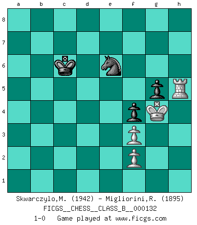 Last move : 1-0 2011 April 10 15:56:36 [Event "FICGS__CHESS__CLASS_B__000132"] [Site "FICGS"] [Date "2010.12.21"] [Round "1"] [White "Skwarczylo,Marek"] [Black "Migliorini,Roberto"] [Result "1-0"] [WhiteElo "1942"] [BlackElo "1895"] 1.d4 Nf6 2.Nf3 g6 3.c4 Bg7 4.Nc3 d5 5.cxd5 Nxd5 6.e4 Nxc3 7.bxc3 c5 8.Be3 Qa5 9.Qd2 Bg4 10.Rb1 a6 11.Rc1 Bxf3 12.gxf3 e6 13.d5 exd5 14.exd5 Nd7 15.c4 Qb6 16.Be2 O-O 17.O-O Qd6 18.Rb1 b6 19.a4 f5 20.Bf4 Be5 21.Bxe5 Nxe5 22.Rb2 Rab8 23.Rfb1 f4 24.a5 Nd7 25.axb6 Rxb6 26.Rxb6 Nxb6 27.Bf1 Nd7 28.Bh3 Ne5 29.Qc3 Kg7 30.Re1 Re8 31.Be6 Kf6 32.Kg2 h6 33.h4 Rxe6 34.dxe6 Kxe6 35.Qc2 Kf6 36.Qe4 Nf7 37.Qb7 Kg7 38.Qb2+ Qf6 39.Qa3 Qxh4 40.Qxc5 Qg5+ 41.Qxg5 Nxg5 42.Ra1 Ne6 43.Rxa6 Kf6 44.Rd6 g5 45.Kh3 h5 46.Rd5 Nc7 47.Ra5 Ne6 48.c5 Ke5 49.c6 Kd6 50.Ra8 Kxc6 51.Rh8 Nd4 52.Rxh5 Ne6 53.Kg4 1-0 King's Indian : East Indian defense Kingside Castling by player Black (move 16) Kingside Castling by player White (move 17) 10 pieces endgame at move 43 : White KRPPP , Black KNPPP WHITE : King + 1 Rook 3 Pawns BLACK : King + 1 Knight 3 Pawns 9 pieces endgame at move 50 : White KRPP , Black KNPPP WHITE : King + 1 Rook 2 Pawns BLACK : King + 1 Knight 3 Pawns 8 pieces endgame at move 52 : White KRPP , Black KNPP WHITE : King + 1 Rook 2 Pawns BLACK : King + 1 Knight 2 Pawns Player White won this chess game. Follow this game move after move (download)A great player and a great example for many. His book My 60 Memorable Games had a big impact on me. It is a shame he didn't continue to enrich the world of chess with his unparalleled understanding after 1972. (Jan Timman, about Bobby Fischer's death) Karpov ist ein Museumsstück. (Garry Kasparov) Una compensación adecuada por un sacrificio es tener una combinación sólida que conduce a una posición ganadora; una compensación adecuada por una metida de pata es dejar a tu oponente arrebatar una derrota de las fauces de la victoria. (Bruce A. Moon) On entre au jeu d'Echecs comme on entre en Religion. Pour le joueur d'Echecs, la partie d'Echecs c'est l'office, la messe, le défilé du 1er Mai, le dépôt de gerbe au Monument aux Morts. C'est un drame sacré. (Michel Roos) Life is like a play: it's not the length but the excellence of the acting that matters. (Seneca)