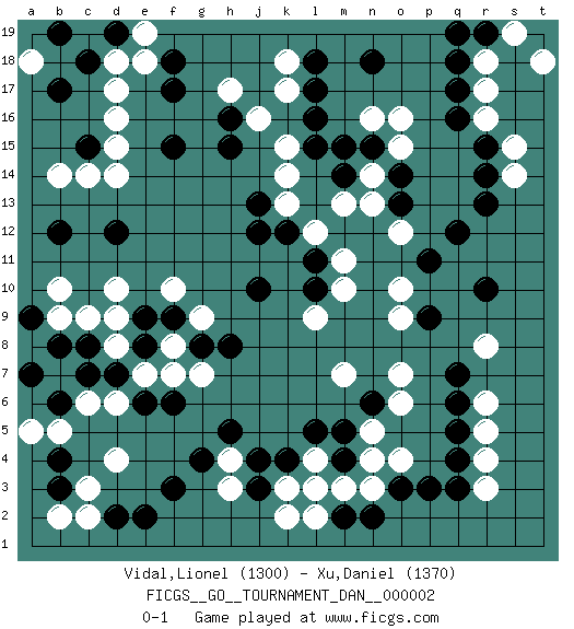 Last move : 0-1 2007 March 10 8:17:17 [Event "FICGS__GO__TOURNAMENT_DAN__000002"] [Site "FICGS"] [Date "2006.12.04"] [Round "1"] [Black "Vidal,Lionel"] [White "Xu,Daniel"] [Result "0-1"] [Rating 1 "1300"] [Rating 2 "1370"] 1.q16 d4 2.q3 d16 3.f3 d6 4.k4 r5 5.q7 r3 6.q4 r4 7.q5 r6 8.q6 r8 9.f17 j16 10.l16 d17 11.f15 d14 12.h15 k15 13.l15 k14 14.j13 k13 15.j12 m13 16.k12 l12 17.m14 o16 18.o14 r17 19.q17 r16 20.r15 s15 21.r14 r18 22.q18 s14 23.q12 d10 24.l10 m10 25.l11 m11 26.p9 o10 27.r10 l9 28.j10 n14 29.n15 n13 30.o13 o12 31.p11 h17 32.h16 k17 33.l17 k18 34.l18 m7 35.m5 o9 36.c15 d15 37.b17 c14 38.c18 d18 39.b19 a18 40.d19 e18 41.f18 e19 42.d2 c3 43.d12 h3 44.g4 k3 45.l3 h4 46.h5 l2 47.j3 k2 48.j4 m3 49.n2 n3 50.o3 n5 51.m2 l4 52.l5 o4 53.p3 o7 54.m4 n4 55.l3 o15 56.r13 l4 57.n6 o6 58.l3 n16 59.m15 l4 60.n18 l3 61.r19 s19 62.q19 t18 63.c8 c2 64.e2 b7 65.c7 c6 66.b6 b5 67.b8 b14 68.b12 e7 69.e8 f8 70.f9 d8 71.e9 d9 72.d7 b9 73.a7 c9 74.e6 f7 75.f6 g9 76.g8 g7 77.h8 f10 78.b4 a5 79.b3 b2 80.a9 b10 0-1 Here are the names of the openings (joseki) played in the four corners : Corner d4 : d4 f3 Hoshi (Hwajeom, Seongjeom, Xingwei`) 4-4 Point. The star or hoshi (4-4) point, emphasizing influence at the potential expense of territory. Ikken Kakari (Hankan Keolch'im, Yi Gua`jiao~, 1-Space Low Approach). Black 2 is the standard approach move to the 4-4. Corner q4 : q3 r5 Komoku (Somok, Xiao~mu`) 3-4 Point. The komoku (3-4) point is the traditional corner enclosure move.. Ikken Kakari (Hankan Keolch'im, Yi Gua`jiao~, 1-Space Low Pincer). The small knight move is the basic approach move to the 3-4 point stone. It has been continually used for over four centuries. There are limitless variations, with new moves constantly being discovered. White 2 opens the door to a treaure store of joseki. Corner d16 : d16 f17 Hoshi (Hwajeom, Seongjeom, Xingwei`) 4-4 Point. The star or hoshi (4-4) point, emphasizing influence at the potential expense of territory. Ikken Kakari (Hankan Keolch'im, Yi Gua`jiao~, 1-Space Low Approach). Black 2 is the standard approach move to the 4-4. Player White won this Go (weiqi, baduk) game. Follow this game move after move (download)If you don't know ladders, don't play go. (Anonymous) Unless I accept my faults I will most certainly doubt my virtues. (Hugh Prather)