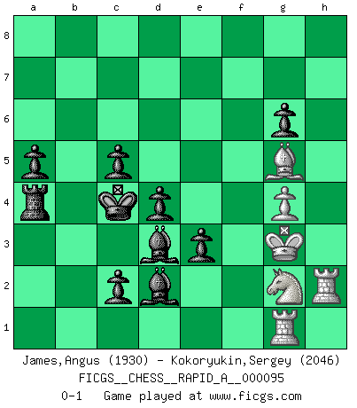 Last move : 0-1 2011 March 16 13:9:35 [Event "FICGS__CHESS__RAPID_A__000095"] [Site "FICGS"] [Date "2010.12.21"] [Round "1"] [White "James,Angus"] [Black "Kokoryukin,Sergey"] [Result "0-1"] [WhiteElo "1930"] [BlackElo "2046"] 1.e4 c5 2.Nf3 d6 3.Bb5+ Nc6 4.Bxc6+ bxc6 5.O-O e5 6.c3 Nf6 7.d4 Nxe4 8.Re1 f5 9.dxe5 d5 10.Qa4 Qb6 11.c4 Qa6 12.Qxa6 Bxa6 13.Nh4 g6 14.f3 Bxc4 15.fxe4 fxe4 16.Nc3 Bd3 17.Na4 c4 18.Be3 Rb8 19.b3 Bb4 20.Rec1 Ba3 21.Rd1 Rb4 22.Re1 Rxa4 23.bxa4 c5 24.Kf2 O-O 25.Kg3 c3 26.Rh1 d4 27.Bh6 Re8 28.Kf4 c2 29.g4 Kf7 30.Ng2 Rb8 31.Rae1 Rb1 32.e6+ Kxe6 33.Kg3 Bb4 34.Rc1 Rb2 35.h4 Kd5 36.h5 Kc4 37.hxg6 hxg6 38.Bg5 Rxa2 39.Rh2 a5 40.Rg1 Rxa4 41.Nf4 e3 42.Ng2 Bd2 0-1 Sicilian : Canal-Sokolsky (Nimzovich-Rossolimo, Moscow) attack Kingside Castling by player White (move 5) Kingside Castling by player Black (move 24) Player Black won this chess game. Follow this game move after move (download)Chess is above all, a fight ! (Emanuel Lasker) Ein Gewinn durch eine ungenaue Kombination, sei sie auch noch so vorzeigbar, erfüllt mich mit Schaudern. (Wilhelm Steinitz) Evita las multitudes. Haz independientemente tu propio razonamiento. Trata de ser el jugador de Ajedrez, no la pieza de Ajedrez. (Ralph Charell) Ne tendez aucun piège pour le plaisir ! Ne jouez rien dans l'espoir que l'adversaire réagisse de façon stupide ! Prenez toujours pour acquis que l'adversaire va trouver le meilleur coup ! Ne jouez jamais de coup dans l'espoir que l'adversaire ne voie pas la menace ! Chacun de vos coups doit améliorer la position d'une façon ou d'une autre. It is a good thing for an uneducated man to read books of quotations. (Winston Churchill)