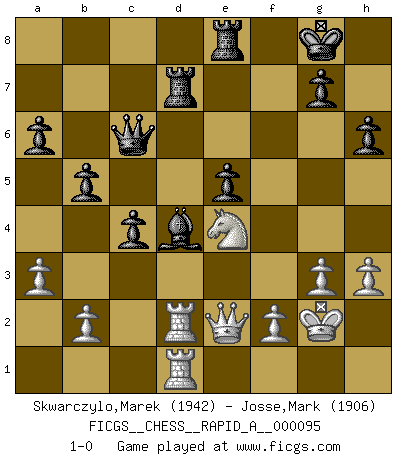 Last move : 1-0 2011 March 28 1:52:11 [Event "FICGS__CHESS__RAPID_A__000095"] [Site "FICGS"] [Date "2010.12.21"] [Round "1"] [White "Skwarczylo,Marek"] [Black "Josse,Mark"] [Result "1-0"] [WhiteElo "1942"] [BlackElo "1906"] 1.d4 Nf6 2.Nf3 e6 3.c4 d5 4.Nc3 c6 5.e3 Nbd7 6.Bd3 dxc4 7.Bxc4 b5 8.Bd3 a6 9.e4 c5 10.d5 Qc7 11.dxe6 fxe6 12.O-O Bb7 13.Qe2 c4 14.Bc2 Bd6 15.g3 O-O 16.Nd4 Rfe8 17.Rd1 Bc5 18.h3 Rad8 19.a3 Ne5 20.Be3 Qb6 21.Nf3 Bxe3 22.Nxe5 Bd4 23.Nf3 e5 24.Rd2 Qc5 25.Rad1 Bc6 26.Bb1 Rd7 27.Nd5 Nxd5 28.exd5 Rxd5 29.Be4 Rd6 30.Ng5 h6 31.Bxc6 Qxc6 32.Ne4 Rd7 33.Kg2 1-0 This chess game has been lost on time (started : 2010.12.21 14:9:21) Queen's pawn game Kingside Castling by player White (move 12) Kingside Castling by player Black (move 15) Player White won this chess game. Follow this game move after move (download)Chess is a terrible game. If you have no center, your opponent has a freer position. If you do have a center, then you really have something to worry about ! (Siegbert Tarrasch) Ich brauche nur einen Blick auf das Schachbrett zu werfen, und weiß schon, was in der Stellung steckt, was geschehen kann und was geschehen wird. Alle übrigen suchen und prüfen, ich aber weiß es! (José Raúl Capablanca) Existen dos clases de sacrificios: los correctos y los míos. (Mikhail Tal) Ce qui est bien, c'est d'avoir tout un tas de pièces en prise : l'adversaire ne peut en prendre qu'une à la fois. Cité par Thierry Audin. Mandala - that's it! 16x16 squares as multiple of the four and the eight because of the Four Noble Truths and the Noble Eightfold Path. (Heinz-Georg Lehnhoff about Big Chess)