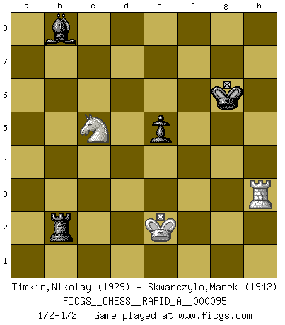 Last move : 1/2-1/2 2011 April 2 16:50:14 [Event "FICGS__CHESS__RAPID_A__000095"] [Site "FICGS"] [Date "2010.12.21"] [Round "1"] [White "Timkin,Nikolay"] [Black "Skwarczylo,Marek"] [Result "1/2-1/2"] [WhiteElo "1929"] [BlackElo "1942"] 1.e4 c5 2.Nf3 Nc6 3.d4 cxd4 4.Nxd4 Nf6 5.Nc3 e5 6.Ndb5 d6 7.Bg5 a6 8.Na3 b5 9.Bxf6 gxf6 10.Nd5 f5 11.Bd3 Be6 12.O-O Bxd5 13.exd5 Ne7 14.c3 Bg7 15.Nc2 e4 16.Be2 O-O 17.a4 bxa4 18.Rxa4 a5 19.Qd2 Qb6 20.Ne3 Rfb8 21.Nc4 Qb5 22.Ra2 Qxd5 23.Qxd5 Nxd5 24.Nxd6 Ne7 25.Rd1 Rd8 26.Nc4 Rxd1+ 27.Bxd1 Rd8 28.Bh5 Nc6 29.g3 f4 30.gxf4 Bh6 31.Bg4 Bxf4 32.Bf5 Rd1+ 33.Kg2 Re1 34.Ra4 Ne7 35.Rxa5 Kg7 36.Rc5 Ng6 37.b4 Nh4+ 38.Kh3 Ng6 39.b5 Re2 40.Kg4 Bxh2 41.b6 Rxf2 42.Bxe4 Rf4+ 43.Kh3 Rh4+ 44.Kg2 Nf4+ 45.Kf3 Rh3+ 46.Kf2 Rxc3 47.Ke1 Ne6 48.Rc6 h5 49.b7 h4 50.Rc8 Rb3 51.Nd2 Rb4 52.Bd5 Bg3+ 53.Kf1 Rb2 54.Bxe6 fxe6 55.Ne4 Be5 56.Rc5 Bb8 57.Rg5+ Kh6 58.Rg4 Rxb7 59.Rxh4+ Kg6 60.Nc5 Rb1+ 61.Ke2 e5 62.Rh3 Rb2+ 1/2-1/2 Sicilian : Pelikan (Lasker/Sveshnikov) variation Kingside Castling by player White (move 12) Kingside Castling by player Black (move 16) 10 pieces endgame at move 54 : White KRBNP , Black KRBPP WHITE : King + 1 Rook 1 Bishop 1 Knight 1 Pawn BLACK : King + 1 Rook 1 Bishop 2 Pawns 9 pieces endgame at move 54 : White KRNP , Black KRBPP WHITE : King + 1 Rook 1 Knight 1 Pawn BLACK : King + 1 Rook 1 Bishop 2 Pawns 8 pieces endgame at move 58 : White KRN , Black KRBPP WHITE : King + 1 Rook 1 Knight BLACK : King + 1 Rook 1 Bishop 2 Pawns 7 pieces endgame at move 59 : White KRN , Black KRBP WHITE : King + 1 Rook 1 Knight BLACK : King + 1 Rook 1 Bishop 1 Pawn This chess game ended in a draw. Follow this game move after move (download)I feel as if I were a piece in a game of Chess, when my opponent says of it: That piece cannot be moved. (Soren Kierkegaard) Je mehr ich von der FIDE weiss, um so weniger verstehe ich. (Alexander Kalifman) Los finales de Peón son del Ajedrez lo que el cesped es del Golf. (Cecil Purdy) Je crois qu'il existe des manières très spécifiques de jouer efficacement contre une machine. Evidemment, nous n'avons aucune chance en technique pure, parce que l'ordinateur calcule de manière parfaite. Mais lorsque nous faisons appel à notre cerveau, en utilisant l'intuition et la compréhension, alors nous restons beaucoup plus forts. (Anatoli Karpov) All the troubles of the world come from being unable to sit alone in a quiet room. (Blaise Pascal)