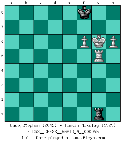 Last move : 1-0 2011 May 8 16:22:4 [Event "FICGS__CHESS__RAPID_A__000095"] [Site "FICGS"] [Date "2010.12.21"] [Round "1"] [White "Cade,Stephen"] [Black "Timkin,Nikolay"] [Result "1-0"] [WhiteElo "2042"] [BlackElo "1929"] 1.d4 Nf6 2.c4 e6 3.Nc3 d5 4.cxd5 exd5 5.Bg5 Be7 6.e3 O-O 7.Bd3 Nbd7 8.Nge2 c6 9.Qc2 Re8 10.O-O h6 11.Bh4 Bd6 12.Bg3 Nf8 13.Rab1 Nh5 14.Bxd6 Qxd6 15.b4 Nf6 16.h3 Bd7 17.Nf4 Ne6 18.Nxe6 Rxe6 19.b5 cxb5 20.Nxb5 Qf8 21.Nc3 b6 22.Rfc1 Rc8 23.Qb3 Rec6 24.Rc2 Be6 25.Rbc1 Qe7 26.Qa4 R6c7 27.Ba6 Rd8 28.Nb5 Rxc2 29.Qxc2 Ne4 30.Qc7 Rd7 31.Qf4 Rd8 32.a3 Kh7 33.f3 Nf6 34.Qc7 Rd7 35.Qe5 Rd8 36.Rc7 Rd7 37.Rc3 Ne8 38.Bc8 Rd8 39.Bxe6 Qxe6 40.Nxa7 Nd6 41.Qxe6 fxe6 42.Rc6 b5 43.Ra6 Ra8 44.Rxd6 Rxa7 45.Rxe6 Rxa3 46.Rb6 Rb3 47.Kf2 Rb2+ 48.Kg3 b4 49.e4 b3 50.exd5 Rd2 51.Rxb3 Rxd4 52.Rb5 Kg6 53.Rb6+ Kf7 54.d6 Kf6 55.h4 Rd2 56.h5 Rd4 57.Kh3 Rd3 58.Kg4 Rd2 59.g3 Rd4+ 60.f4 Ke6 61.d7 Kf7 62.Rb7 Kf6 63.Kf3 Rd3+ 64.Ke4 Rd1 65.g4 Re1+ 66.Kd5 Rd1+ 67.Kc5 Ke6 68.d8Q Rxd8 69.Rxg7 Rf8 70.Rg6+ Ke7 71.f5 Rh8 72.Kd5 Kf7 73.Ke5 Re8+ 74.Re6 Rh8 75.f6 Ra8 76.Re7+ Kf8 77.Kf5 Ra5+ 78.Re5 Ra4 79.g5 hxg5 80.h6 Rh4 81.Kxg5 Rh1 82.Kg6 Rg1+ 83.Rg5 1-0 Queen's pawn game Kingside Castling by player Black (move 6) Kingside Castling by player White (move 10) 10 pieces endgame at move 51 : White KRPPPP , Black KRPP WHITE : King + 1 Rook 4 Pawns BLACK : King + 1 Rook 2 Pawns Promotion Queen by player White (move 68) 9 pieces endgame at move 68 : White KRPPP , Black KRPP WHITE : King + 1 Rook 3 Pawns BLACK : King + 1 Rook 2 Pawns 8 pieces endgame at move 69 : White KRPPP , Black KRP WHITE : King + 1 Rook 3 Pawns BLACK : King + 1 Rook 1 Pawn 7 pieces endgame at move 79 : White KRPP , Black KRP WHITE : King + 1 Rook 2 Pawns BLACK : King + 1 Rook 1 Pawn 6 pieces endgame at move 81 : White KRPP , Black KR WHITE : King + 1 Rook 2 Pawns BLACK : King + 1 Rook Player White won this chess game. Follow this game move after move (download)It is no time to be playing Chess when the house is on fire. (Italian Proverb) Alle Schachspieler sollten auch ein Hobby haben. (Savielly Grigorievitsch Tartakower) El ganador de una partida es aquel jugador que hace el penúltimo error. (Savielly Tartakover) Les Echecs ne sont pas pour les âmes timides. Ils requièrent un homme entier, qui ne s'arrête pas aveuglément à ce qui a été déjà établi, mais qui tente individuellement de sonder les profondeurs du jeu. (W. Steinitz) Rules and bones are meant to be broken. (Anonymous)