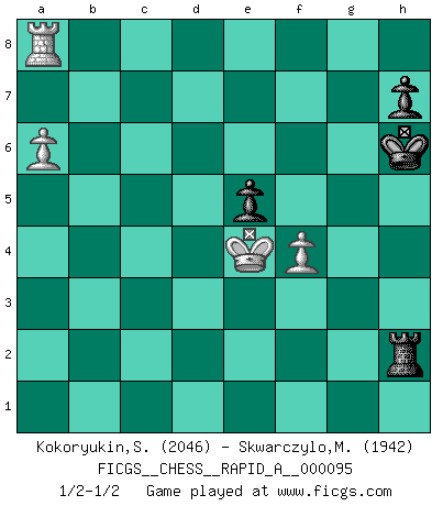 Last move : 1/2-1/2 2011 January 3 11:18:58 [Event "FICGS__CHESS__RAPID_A__000095"] [Site "FICGS"] [Date "2010.12.21"] [Round "1"] [White "Kokoryukin,Sergey"] [Black "Skwarczylo,Marek"] [Result "1/2-1/2"] [WhiteElo "2046"] [BlackElo "1942"] 1.e4 c5 2.Nf3 Nc6 3.d4 cxd4 4.Nxd4 Nf6 5.Nc3 e5 6.Ndb5 d6 7.Bg5 a6 8.Na3 b5 9.Bxf6 gxf6 10.Nd5 f5 11.Bd3 Be6 12.O-O Bxd5 13.exd5 Ne7 14.Nxb5 Bg7 15.Nc3 e4 16.Bc4 Qc7 17.Qe2 Bxc3 18.bxc3 O-O 19.Rfb1 Qc5 20.Rb3 Nxd5 21.Bxd5 Qxd5 22.Rd1 Qe5 23.Rb6 d5 24.Qh5 Ra7 25.Qg5+ Kh8 26.g3 f6 27.Qd2 Rc7 28.Qxd5 e3 29.Qxe5 exf2+ 30.Kxf2 fxe5 31.Rxa6 Rxc3 32.Rd2 Rfc8 33.Ke2 Rxc2 34.a4 Kg7 35.a5 R8c5 36.Ra7+ Kg6 37.a6 Rxd2+ 38.Kxd2 Ra5 39.Ra8 Ra2+ 40.Kc3 f4 41.Kd3 Kh6 42.Ke4 Rxh2 43.gxf4 1/2-1/2 Sicilian : Pelikan (Lasker/Sveshnikov) variation Kingside Castling by player White (move 12) Kingside Castling by player Black (move 18) 10 pieces endgame at move 38 : White KRPPP , Black KRPPP WHITE : King + 1 Rook 3 Pawns BLACK : King + 1 Rook 3 Pawns 9 pieces endgame at move 42 : White KRPP , Black KRPPP WHITE : King + 1 Rook 2 Pawns BLACK : King + 1 Rook 3 Pawns 8 pieces endgame at move 43 : White KRPP , Black KRPP WHITE : King + 1 Rook 2 Pawns BLACK : King + 1 Rook 2 Pawns This chess game ended in a draw. Follow this game move after move (download)Chess makes man wiser and clear-sighted. (Vladimir Putin) Um dein Spiel zu verbessern musst du zuallererst das Endspiel studieren, denn diese kann unabhängig studiert werden. Die Eröffnung und das Mittelspiel müssen immer in Bezug gesetzt werden zum Endspiel. (José Raúl Capablanca) La última cosa en que Fischer estaba interesado era en tonterías, siempre y cuando el Ajedrez estuviera involucrado. (Elie Agur) La victoire dans une partie d'Echecs appartient la plupart du temps à celui qui voit un peu plus loin que l'adversaire. (Lasker) For a mechanic, you seem to do an excessive amount of thinking. (C-3PO in Star Wars ep.2)