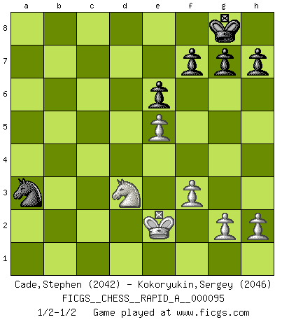 Last move : 1/2-1/2 2011 January 5 17:17:12 [Event "FICGS__CHESS__RAPID_A__000095"] [Site "FICGS"] [Date "2010.12.21"] [Round "1"] [White "Cade,Stephen"] [Black "Kokoryukin,Sergey"] [Result "1/2-1/2"] [WhiteElo "2042"] [BlackElo "2046"] 1.d4 Nf6 2.c4 e6 3.Nc3 Bb4 4.f3 d5 5.a3 Bxc3+ 6.bxc3 c5 7.cxd5 Nxd5 8.dxc5 Qa5 9.e4 Nf6 10.Be3 Nfd7 11.Qd2 O-O 12.c4 Qxd2+ 13.Kxd2 Nc6 14.Nh3 b6 15.cxb6 axb6 16.Be2 Na5 17.Rhb1 Ba6 18.Bxb6 Nxb6 19.Rxb6 Bxc4 20.Ke3 Bxe2 21.Kxe2 Nc4 22.Rb3 Ra4 23.Nf4 Rfa8 24.Nd3 Rxa3 25.Rbxa3 Rxa3 26.Rxa3 Nxa3 27.e5 1/2-1/2 Nimzo-Indian : Kmoch variation Kingside Castling by player Black (move 11) This chess game ended in a draw. Follow this game move after move (download)Morphy was probably the greatest genius of them all. (Bobby Fischer) Das Schachspiel übertrifft alle anderen Spiele so weit wie der Chimborasso einen Misthaufen. (Arthur Schopenhauer) Tu sabes que vas a perder. Aún cuando tenía la ventaja, yo sabía que iba a perder. - al estar jugando con Fischer (Andrew Soltis) Avec des compensations pour le matériel en plus... (Anonyme) In every real man a child is hidden that wants to play. (Friedrich Nietzsche)