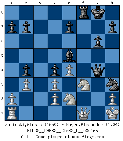 Last move : 0-1 2011 February 15 22:32:0 [Event "FICGS__CHESS__CLASS_C__000165"] [Site "FICGS"] [Date "2010.12.22"] [Round "1"] [White "Zalinski,Alexis"] [Black "Bayer,Alexander"] [Result "0-1"] [WhiteElo "1650"] [BlackElo "1704"] 1.f4 d5 2.Nf3 g6 3.e3 Bg7 4.Be2 Nf6 5.b3 O-O 6.Bb2 c5 7.O-O Bf5 8.Bd3 Bxd3 9.cxd3 Nc6 10.Nc3 d4 11.Ne2 Nb4 12.Nc1 Nfd5 13.e4 Nxf4 14.Ne1 Qd6 15.Qf3 Be5 16.g3 Nh3+ 17.Kg2 Qd7 18.Ba3 f5 19.Bxb4 f4 20.gxf4 Nxf4+ 21.Kh1 cxb4 22.Ne2 Nh3 23.Qg2 Rxf1+ 24.Qxf1 Rf8 25.Nf3 Qg4 0-1 Bird's Opening Kingside Castling by player Black (move 5) Kingside Castling by player White (move 7) Player Black won this chess game. Follow this game move after move (download)Castle early and often. (Rob Sillars) Ich bin Weltmeister und muß mit niemandem irgend etwas diskutieren. (Viswanathan Anand) Te sientas frente a un tablero y repentinamente tu corazón brinca. Tu mano tiembla al tomar una pieza y moverla. Pero lo que el Ajedrez te enseña es que tu debes permanecer ahí con calma y pensar de que si realmente es una buena idea o de que si hay otras ideas mejores. (Stanley Kubrick) Il a essayé de se convaincre qu'il pourrait empêcher toutes les erreurs et ne jamais perdre. L'horreur ! Gary Kasparov au sujet de Robert Fischer. When you have everything, sometimes it feels like nothing. (Horatio Caine, C.S.I. Miami)